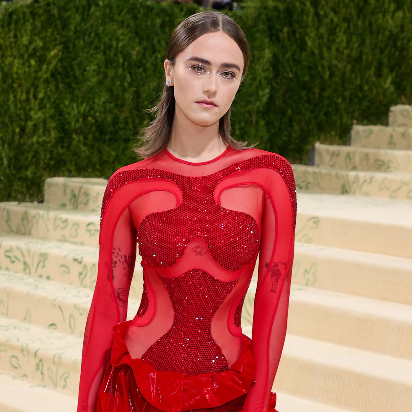 Though the cool, comfy vibe is classic Ella, the skintight top with glitter cutouts, which she accessorised with Cartier jewelry and a Stella McCartney purse, is unlike anything we’ve ever seen her wear. This may be her first-ever Met, but she sure looked like a seasoned pro, even casually posing with Julia Garner at the event. Ahead, see more photos of Ella’s fiery red outfit.
