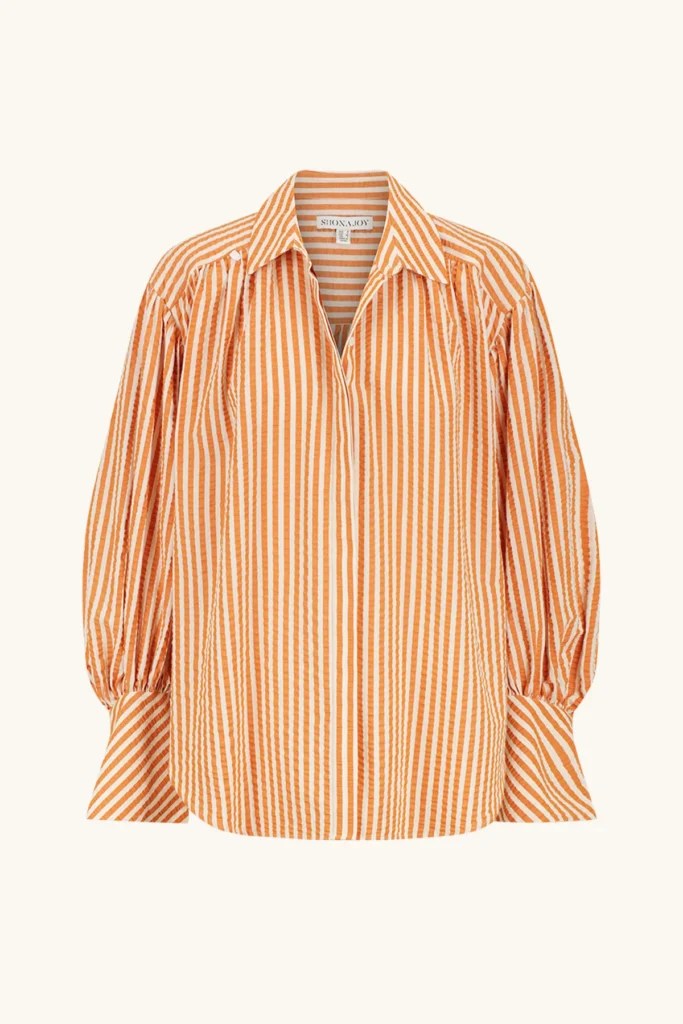I predict this autumn and winter, I’ll be wearing the outfit combo of a vest over a button-up often. This shirt is ideal for that combo, with the volume in its sleeves, oversized cuffs and seersucker material, meaning it doesn’t get lost underneath a vest.