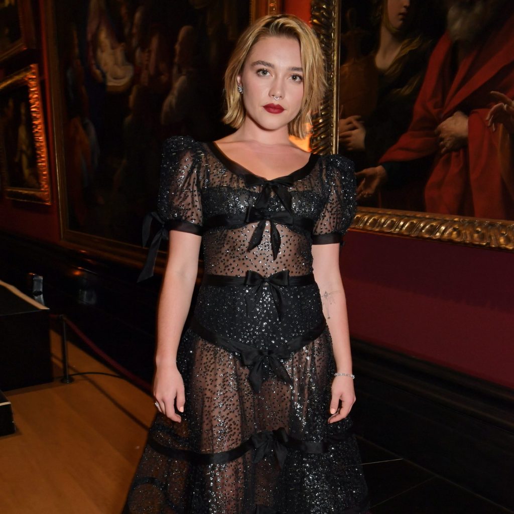 Florence Pugh is on a flawless red carpet run, promoting her movies “Don’t Worry Darling” and “The Wonder” in grand style. On Sept. 5, she brought sartorial drama to the Venice Film Festival, wearing a Valentino Haute Couture sequin sheer gown with a bold front slit. In October, she graced the London Film Festival in a peach, feather-trimmed cutout gown from the French fashion house. Her most recent look fits right in with her red-carpet aesthetic, embracing both the sheer and embellished trends she’s been wearing as of late.