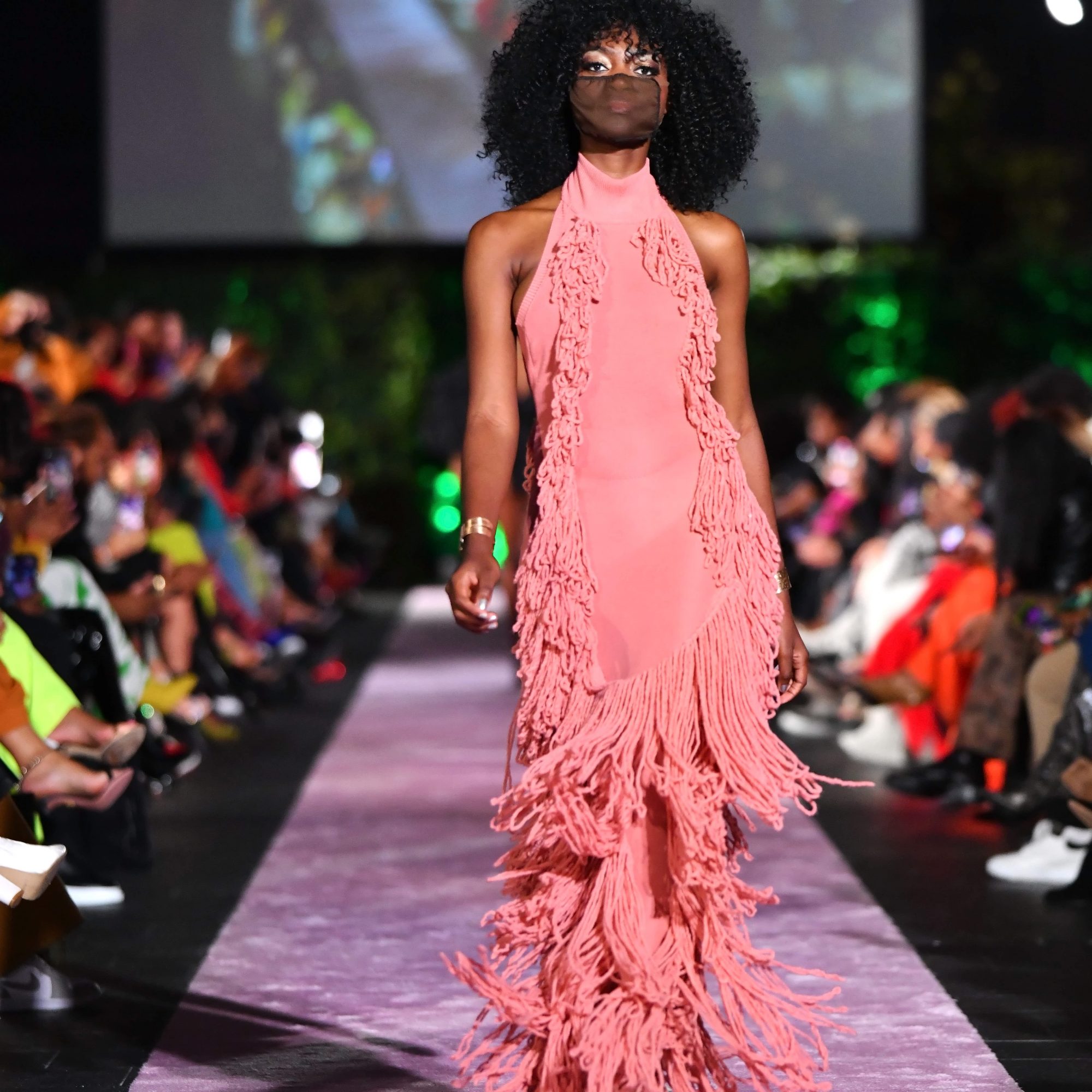The fall ’21 runway show debut took place on a monumental day for the designer, as Nov. 16 marked both the brand’s 10-year anniversary and her 31st birthday. The highly anticipated event comes a year and a half after the brand’s virtual debut for the Pink Label Congo collection, inspired by the Congolese designer’s native country. In 2020, Mvuemba’s plans to showcase her collection at New York Fashion Week were stifled by the pandemic. In an effort to sustain her business and to spread awareness on the issues of mineral site conditions occurring in central Africa, Mvuemba decided to move forward with a virtual collection reveal, via Instagram Live. The Maryland-based designer incorporated her love for tech by using 3D renderings of invisible model silhouettes to showcase each look. The show went viral, capturing the attention of many, showing how the future of fashion shows may evolve.