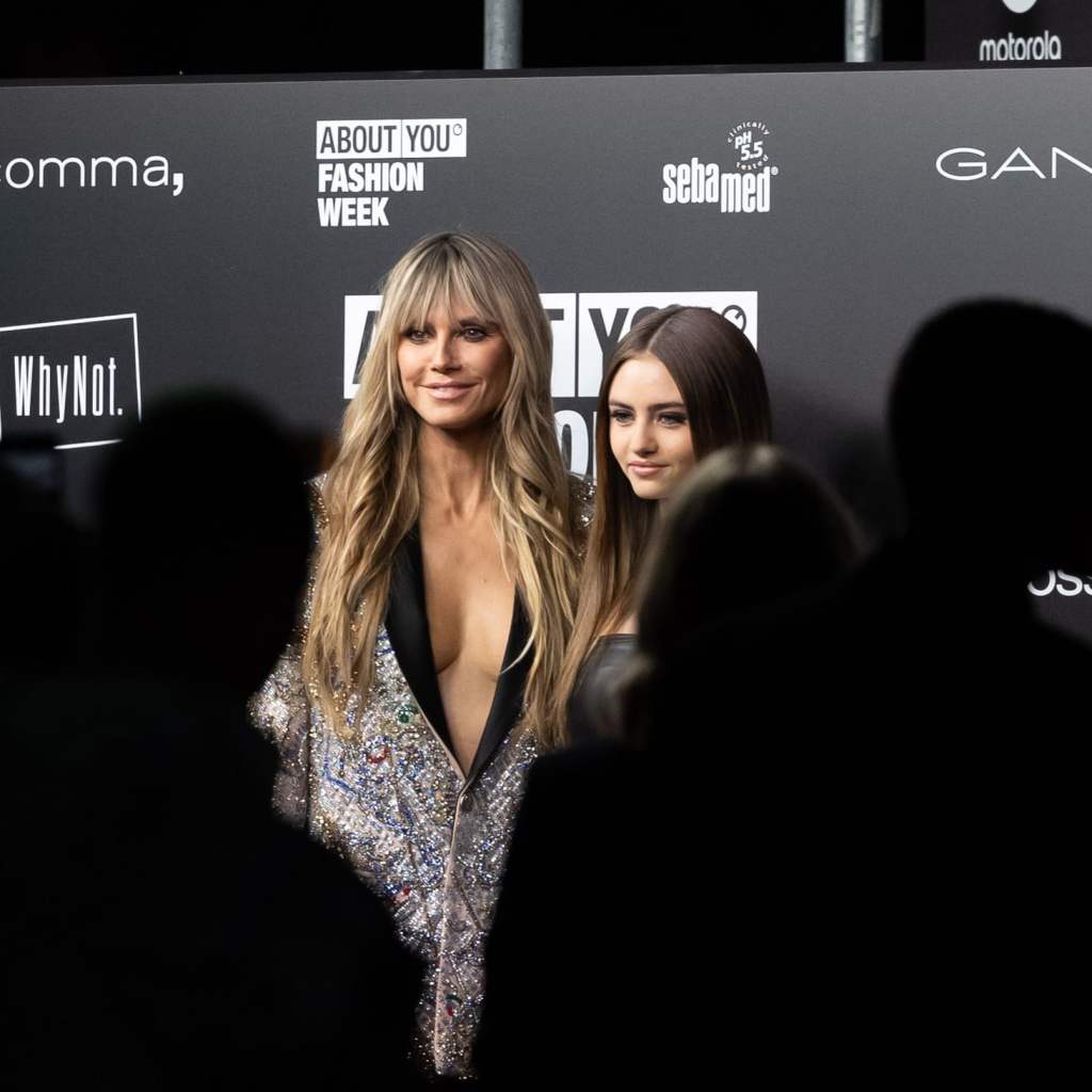 Supermodel mother-daughter duo Heidi and Leni Klum were spotted at Milan Fashion Week, where they attended the About You runway show at Zona Farini on Sept. 20. Coordinating their looks flawlessly for the red carpet arrival, Heidi opted for the more ornate design of the two: a sparkling, embellished oversize blazer from Falguni Shane Peacock India with a plunging neckline, which she wore as a dress, teamed with black spandex over-the-knee boots from Casadei.