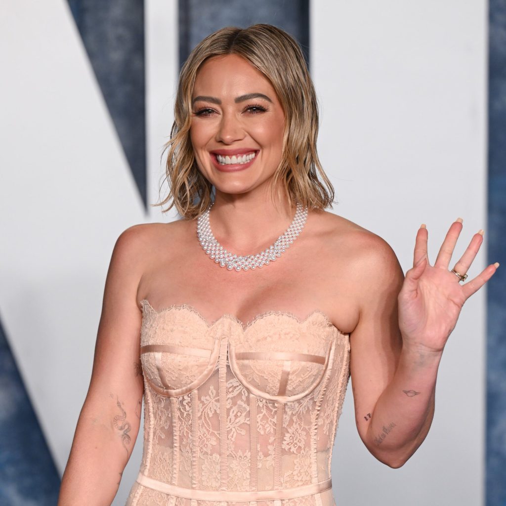 Hilary Duff brought bridal couture to her latest red carpet outing. On March 12, the “How I Met Your Father” actor posed in a lingerie-style peach-colored gown at the Vanity Fair Oscars afterparty, alongside husband Matthew Koma. Covered in delicate floral embroidery, the alluring dress consisted of a corset bodice and sheer lace skirt.
