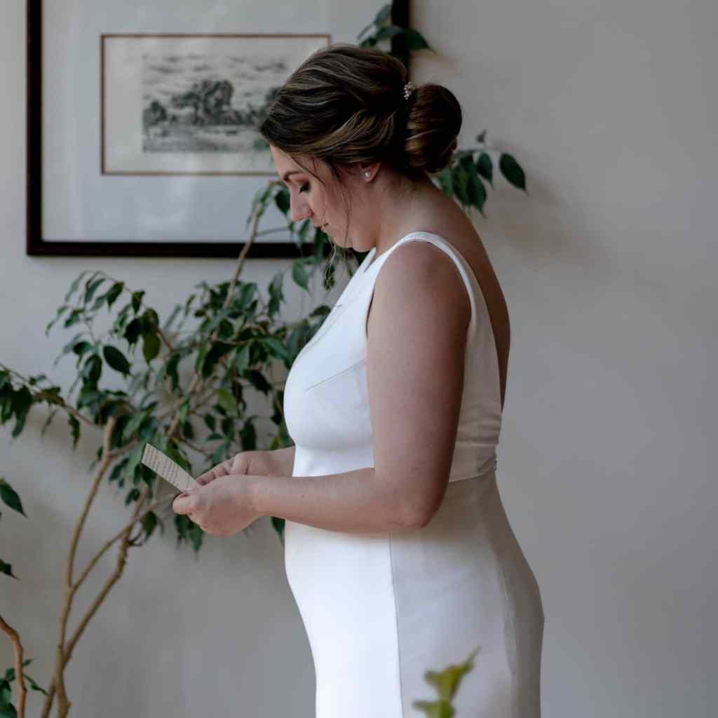 Dafra Sanou, a bridal designer and the founder of wedding platform JoSaBi Mariées, recommends wearing the undergarments and shoes you plan to wear on the special day when taking measurements: “If you’re wearing heels on your wedding day, be sure to take your measurements with heels on. You will want to think about your height on the day versus every day. Whether you prefer padded bras, braless, or Spanx, you want to measure yourself with all that on.”