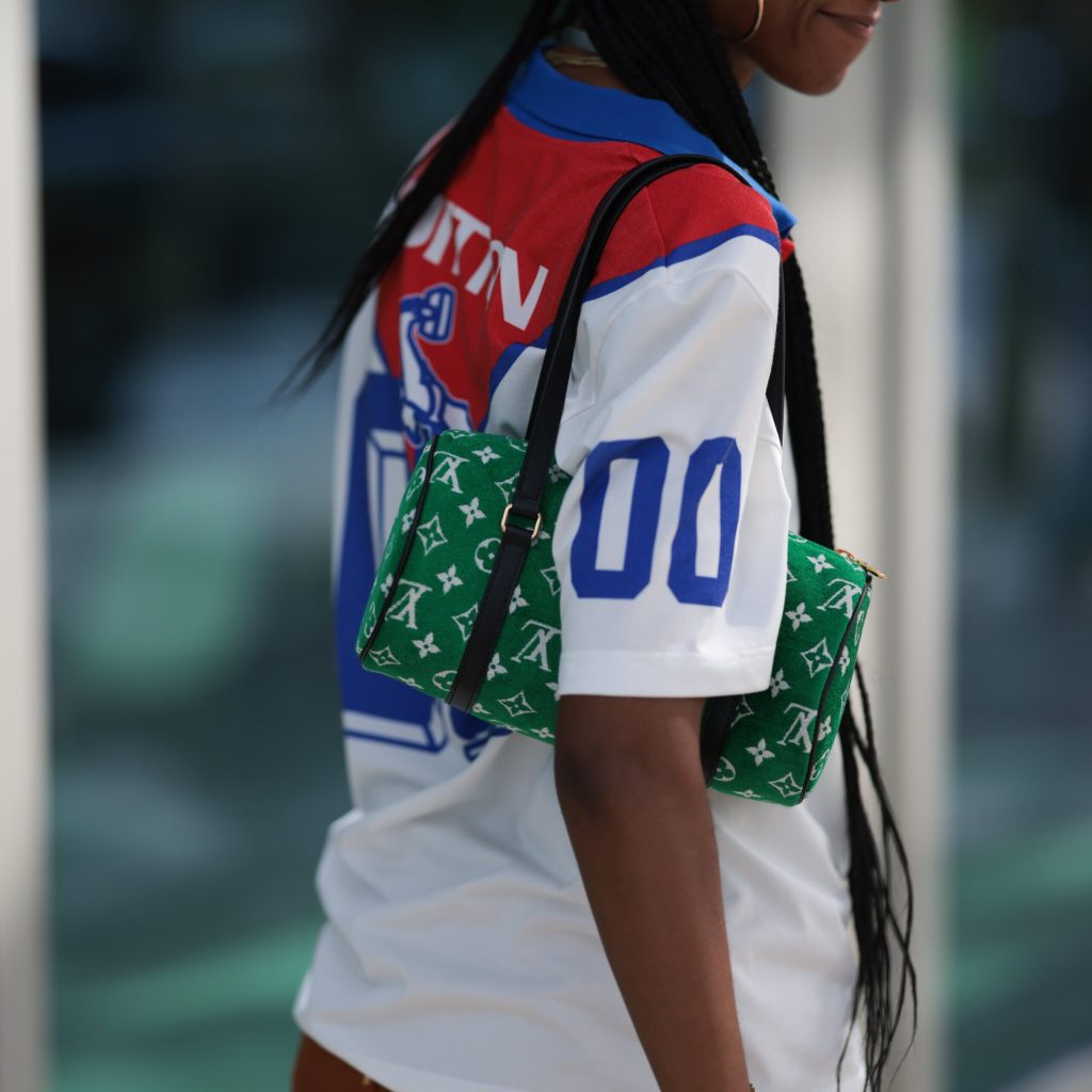 Think primary colors and choose a purse that’s equally as bright as the tones on your jersey. The result is an outfit that feels slightly kidcore-inspired.