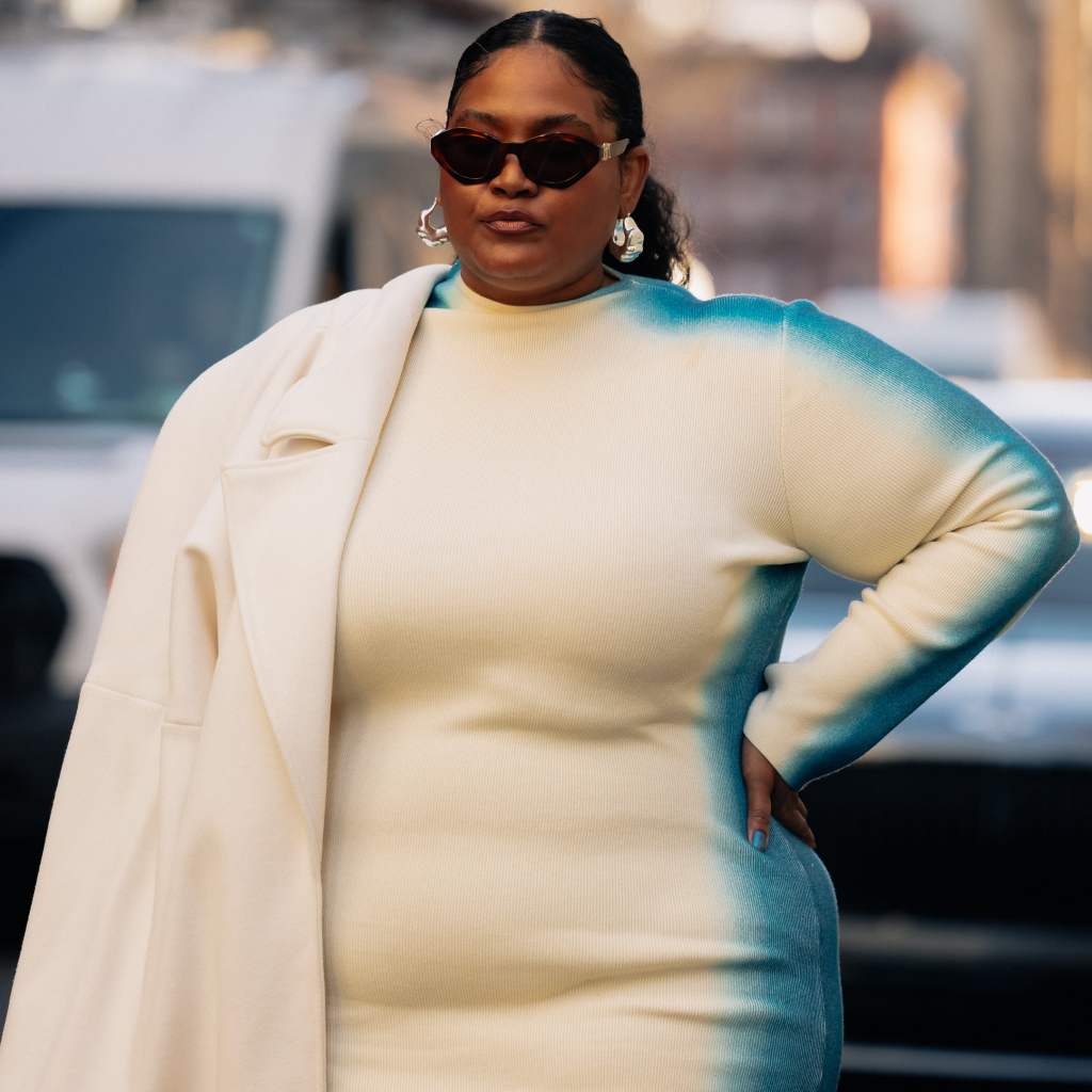 Investing in a long-sleeved ribbed sweater dress will go a long way this season. Complement an ivory-toned dress with a wool jacket in a similar shade, and finish your winter-white outfit with on-trend sunglasses and chunky hoop earrings.