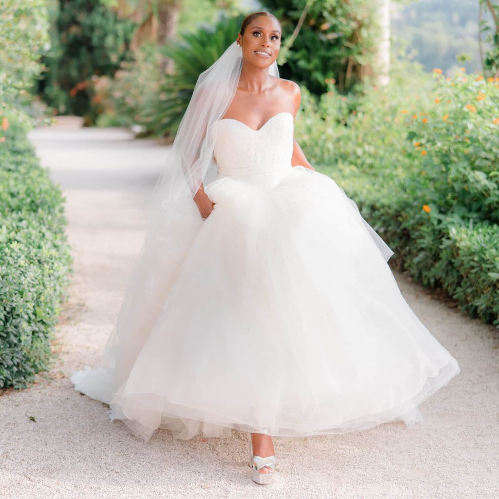 Insecure star Issa Rae is married after confirming her engagement to banking professional Louis Diame back in 2019. The actress worked with Vera Wang Haute to dream up her two custom gowns for her nuptials in the South of France, the first of which came with a strapless sweetheart neckline and hand-sewed crystals across the Chantilly lace bodice. To match, Issa selected a chapel-length veil, and her mirrored platform shoes were standout.