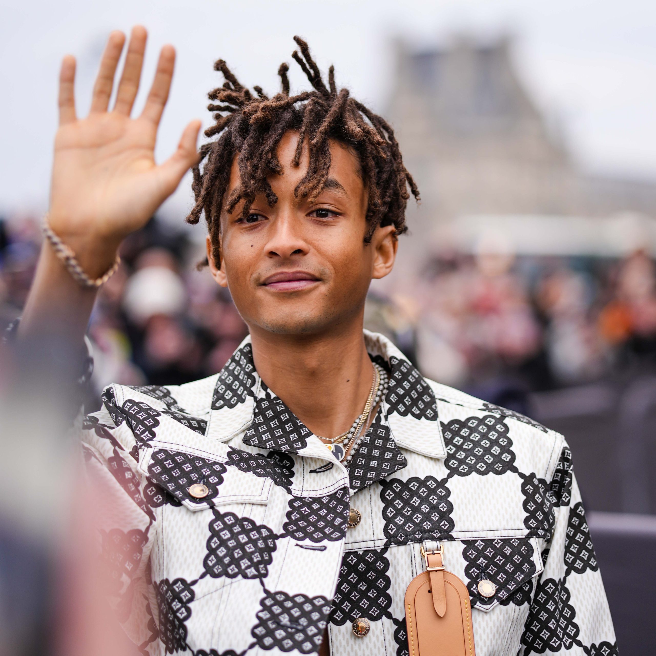 On the final few days of Paris Fashion Week, celebrities stepped out in droves to turn heads in the front row at the fall 2023 runway shows. On Monday, March 6, Jaden Smith made a statement at Louis Vuitton, with onlookers doing a double take at both his outfit and handbag. Wearing a coordinated black-and-white denim cropped trucker jacket and pants, the 24-year-old star finished his look with chunky-soled black shoes, layered chain necklaces, and an LV luggage tag fastened to one of his breast pockets.