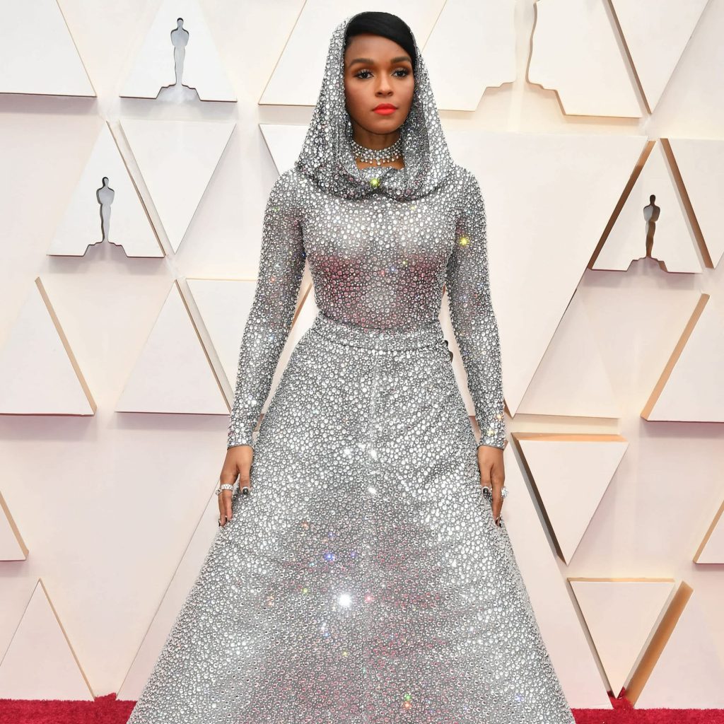 Janelle Monáe brought the *drama* to the 2020 Oscars in her gorgeous ensemble. The singer, who is performing at the award ceremony, wore a stunning silver Ralph Lauren creation. She walked the red carpet in a long-sleeved silver gown that was dripping with crystals. More importantly, her gown came with a hood, completing the look, one that begs the question, “Who needs a knight in shining armor when there’s Janelle Monáe?” The star worked the red carpet in the custom creation that also had a keyhole cutout on the back. The hood of her dress took over 600 hours of hand embroidery and it features over 168,000 Swarovski crystals. She paired her sparkly ensemble with Forevermark jewels. Read on to see all angles of her outfit ahead.