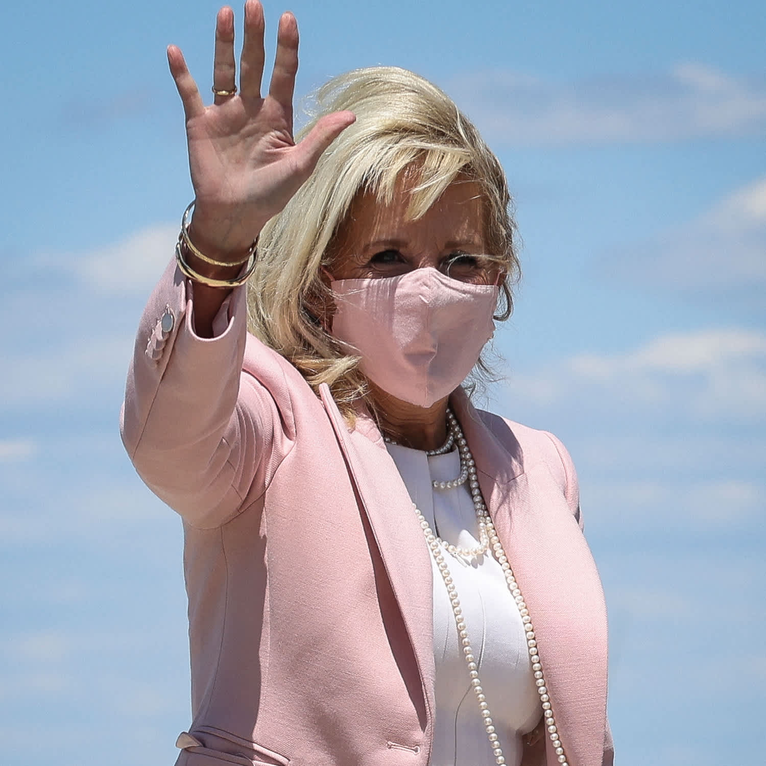 Ready to visit a vaccination centre in Charleston, WV, FLOTUS’s outfit for the day consisted of a baby pink blazer layered over a white swing dress with a lengthy string of white pearls. She also accessorised the look with a pair of Dior J’ADIOR slingback pumps. The brown leather purse, which captures the dogs’ likenesses perfectly, also features Dr. Biden’s initials in white and is embroidered with silver rhinestones that make Champ and Major’s eyes truly pop. Get a look at Dr. Biden’s outfit from all angles here.