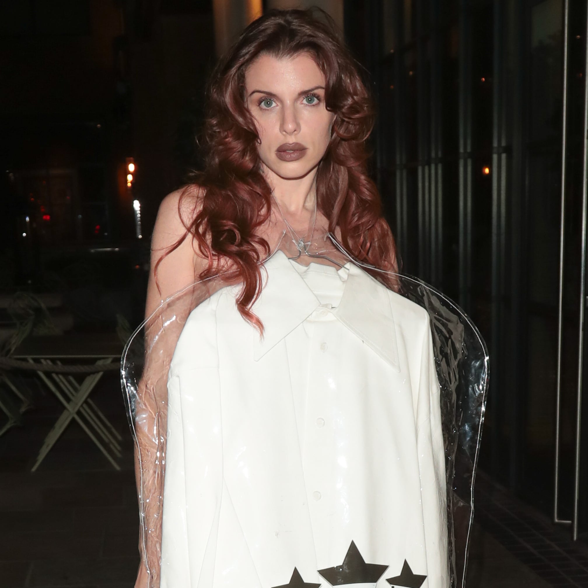 Julia Fox is nothing if not consistent with her jaw-dropping outfits, but with her latest look, she challenges the notion of clothing itself. She recently stepped out in London at the Ham Yard Hotel to promote her memoir “Down the Drain” while wearing a clear garment bag around her neck. And the bag-turned-dress displayed a freshly-pressed shirt on a hanger. The Figura Services design hails from the brand’s fall 2023 collection and was presented similarly on the runway, albeit accessorized with a security tag earring, security seal shoes, and knee socks.