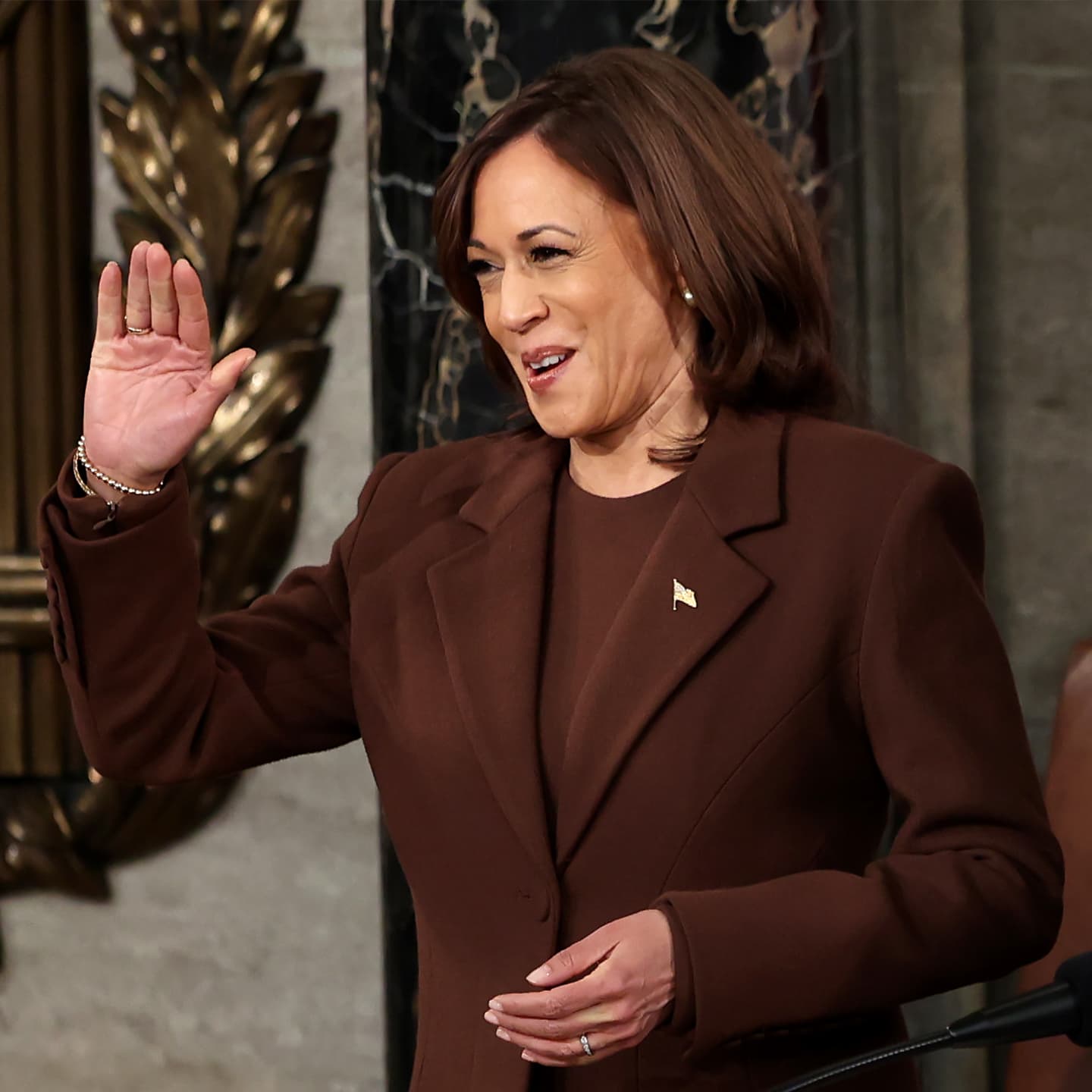 As she stood by the president, Harris, an expert in power dressing, wore a tailored coat and matching dress in a beautiful chocolate-brown shade, custom made by Sergio Hudson. She kept her accessories simple, wearing pearl earrings (her signature), an American-flag pin, and sleek black pumps.