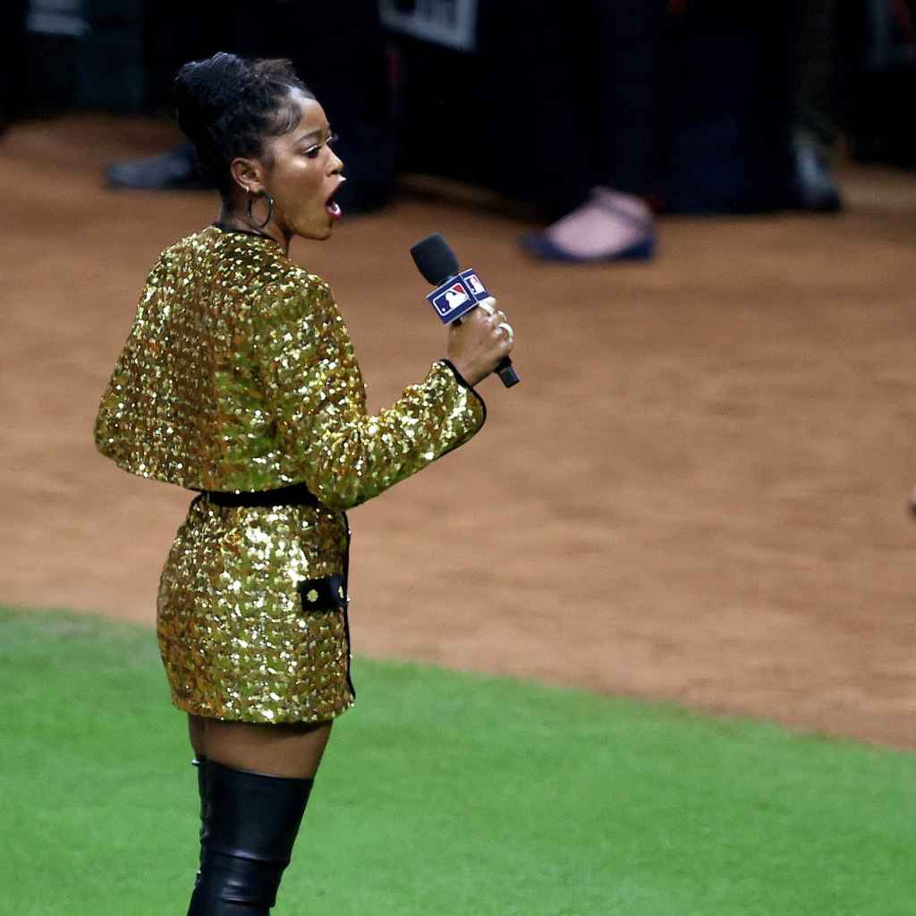 The singer performed the National Anthem in a head-turning gold suit designed by Istanbul-based fashion house Raisa Vanessa, paired with tall Jimmy Choo boots. All eyes were on her as she delivered a beautiful rendition of “The Star-Spangled Banner” in style. And with that, the first game of the World Series between the Atlanta Braves and the Houston Astros was off to a great start!