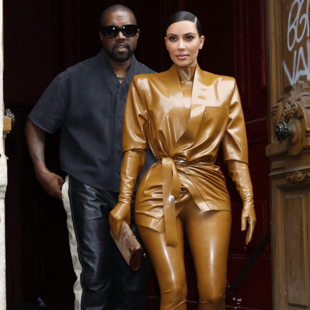 Kim Kardashian called on good friend Olivier Rousteing to design three separate Balmain latex outfits for her appearances at Paris Fashion Week. Kim attended her husband Kanye West’s relocated Sunday Service in the first ensemble, which came complete with full gloved sleeves and a thick coordinating hair tie that she called out on her Instagram stories. I mean, who owns a latex hair tie? Seriously!
