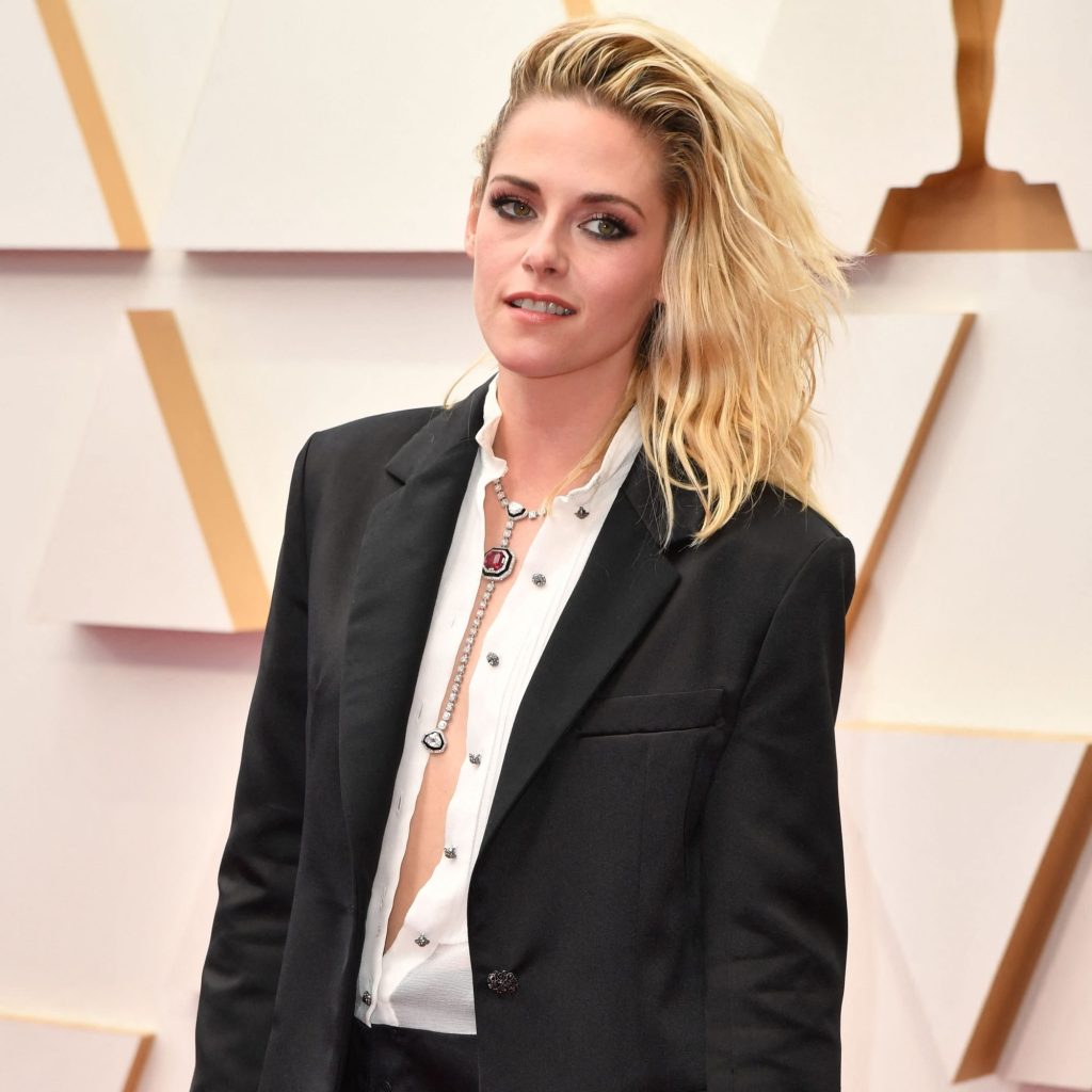 Kristen Stewart was unequivocally herself at the 2022 Oscars. The actor, whose portrayal of Princess Diana in “Spencer” earned her a best actress nomination, attended the award show on March 27 wearing a rock-star take on the traditional tuxedo. Custom-made by Stewart’s brand of choice, Chanel, the suit consists of a black satin blazer and matching shorts with a white blouse left practically unbuttoned. In lieu of a tie, Stewart wore a Chanel diamond lariat necklace and black pointed-toe pumps.