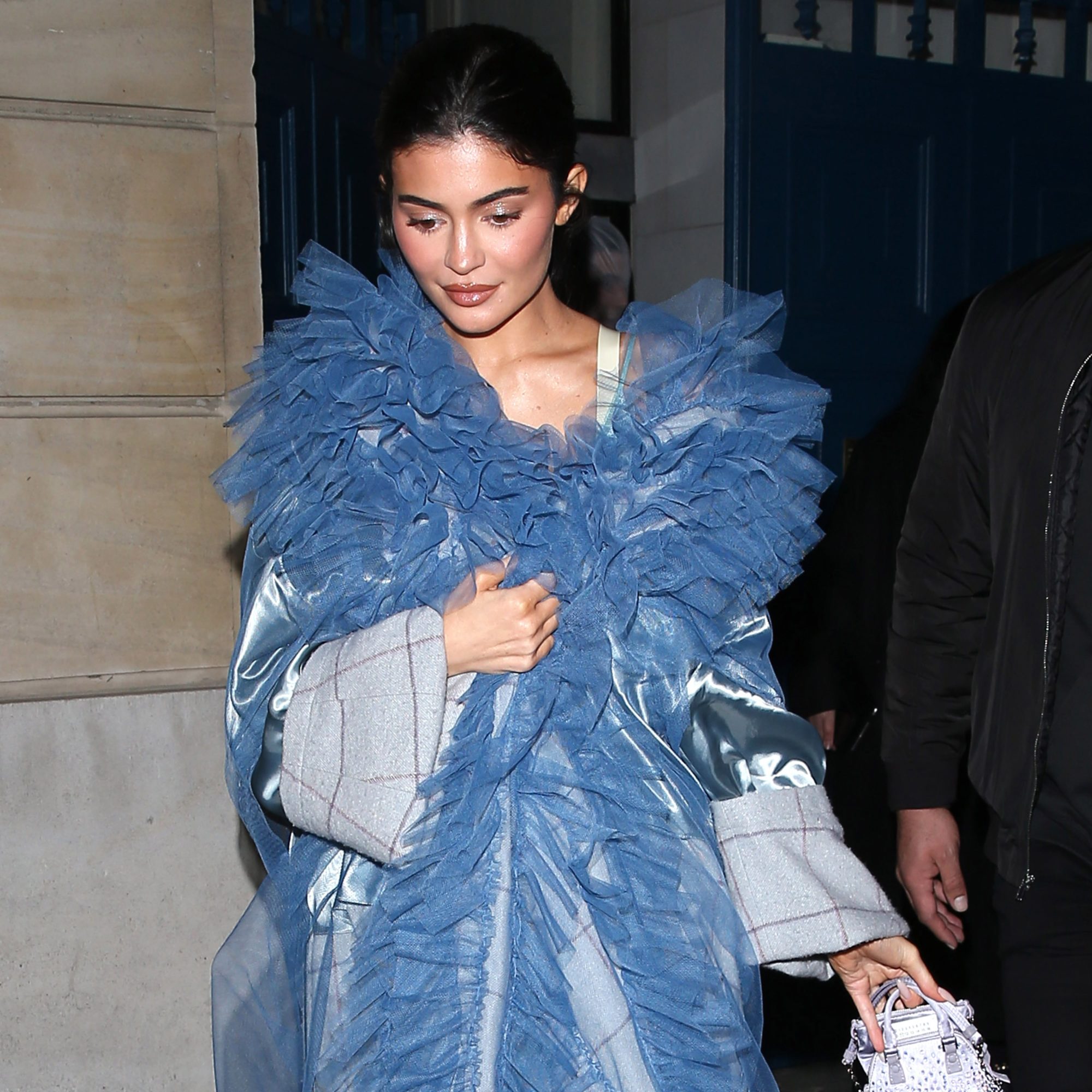 Jenner, who works with stylist duo Alexandra and Mackenzie Grandquist, wore a custom take on one of the runway looks. She stepped out in a wrinkled silk light blue minidress with a choppy hemline; multilayered check coat with cascading tulle ruffles; metallic 5AC Classique baby bag; and rhinestone-encrusted silver Tabi pumps. Jenner’s makeup artist went heavy on the sparkle, with glitter eyeshadow and a glossy caramel lip. Her dark hair was secured into a balloon-like low bun at the nape of her neck. Jenner did not withhold getting-ready photos from her fans, sharing Instagram Stories of her nude latex lingerie, comprised of a set of boy shorts and a cone-bra bustier.
