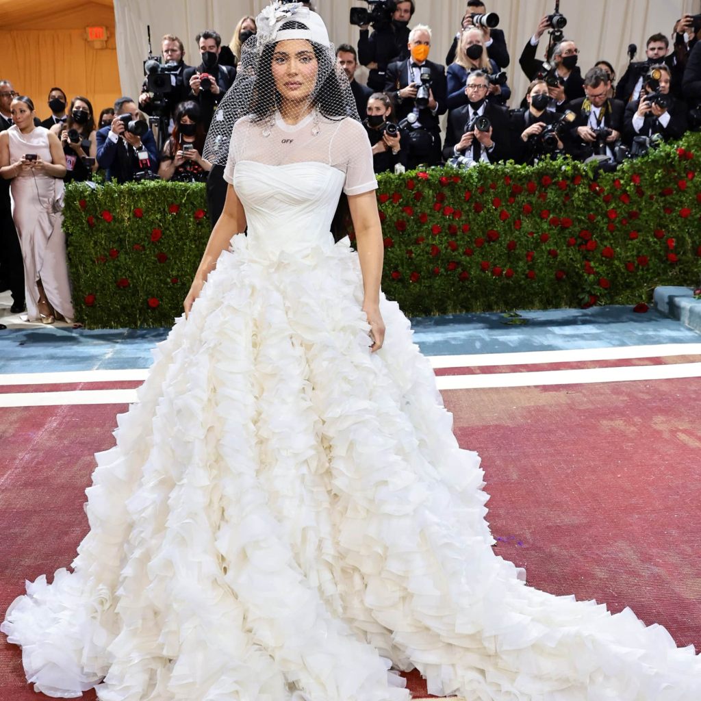 Kylie Jenner walked the 2022 Met Gala red carpet wearing an Off-White design that certainly caught the internet’s attention. The glamorous dress comes from the brand’s fall 2022 couture collection designed by the late Virgil Abloh. Her opulent gown featured a ruched bodice and ruffled skirt, and she accessorised with a matching flower-adorned trucker hat.