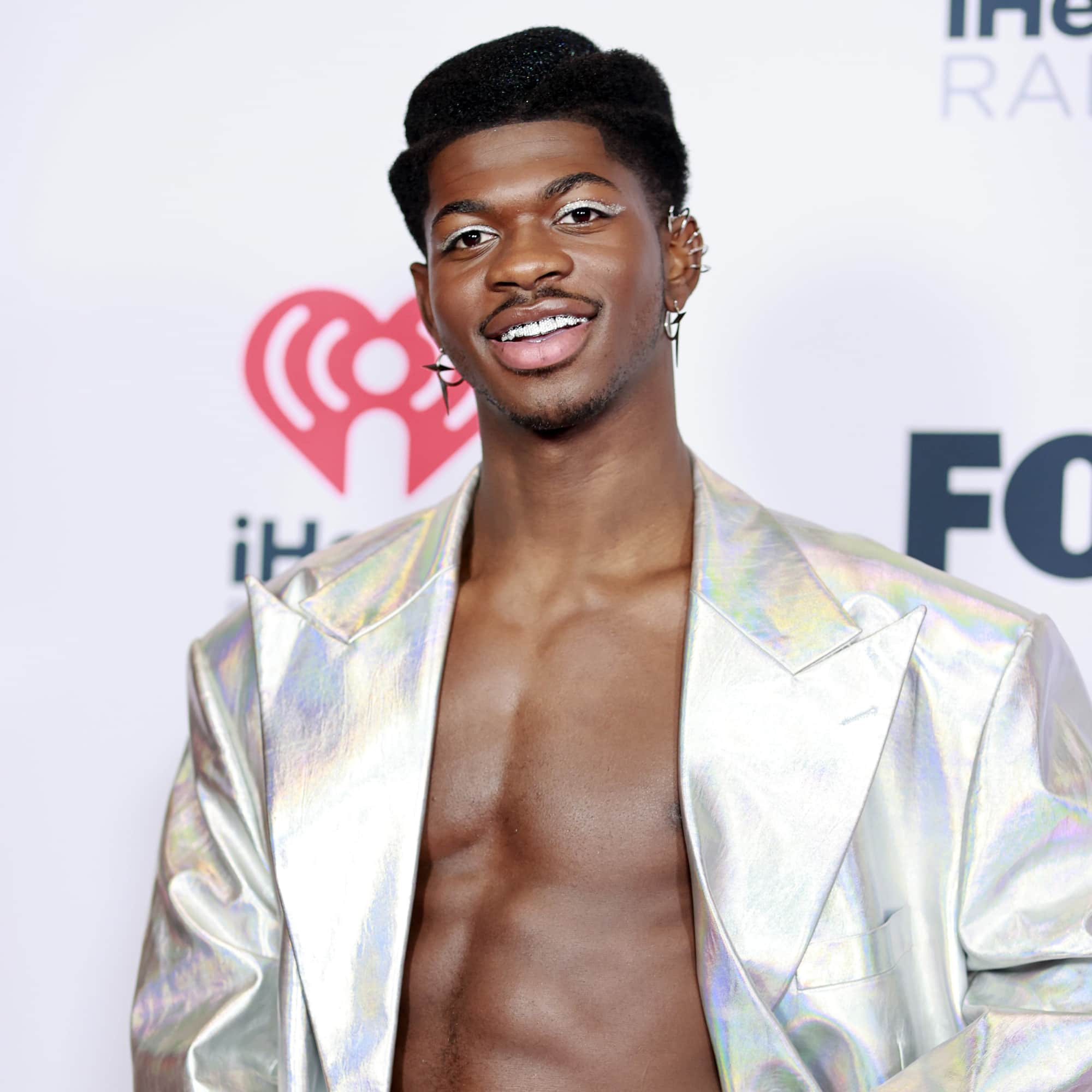 At the 2021 iHeartRadio Music Awards in Los Angeles on Thursday, the rapper wore an iridescent suit with wide lapels and an oversize silhouette reminiscent of ’80s tailoring. Foregoing a shirt, the famously daring dresser paired the outfit with silver earrings, white platform heels, and a teeny Telfar bag, also in white. Browse photos of Lil Nas X in his statement-making suit ahead.