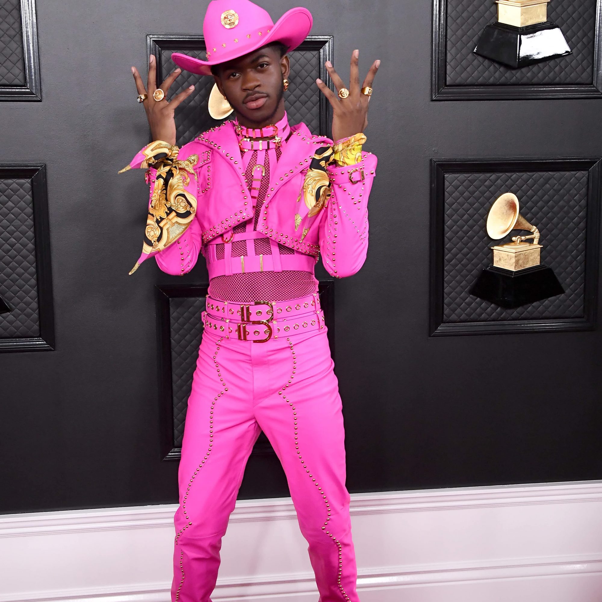 Lil Nas X wore a Barbie-pink leather outfit by Versace complete with pink cowboy boots to the 2020 Grammys.
