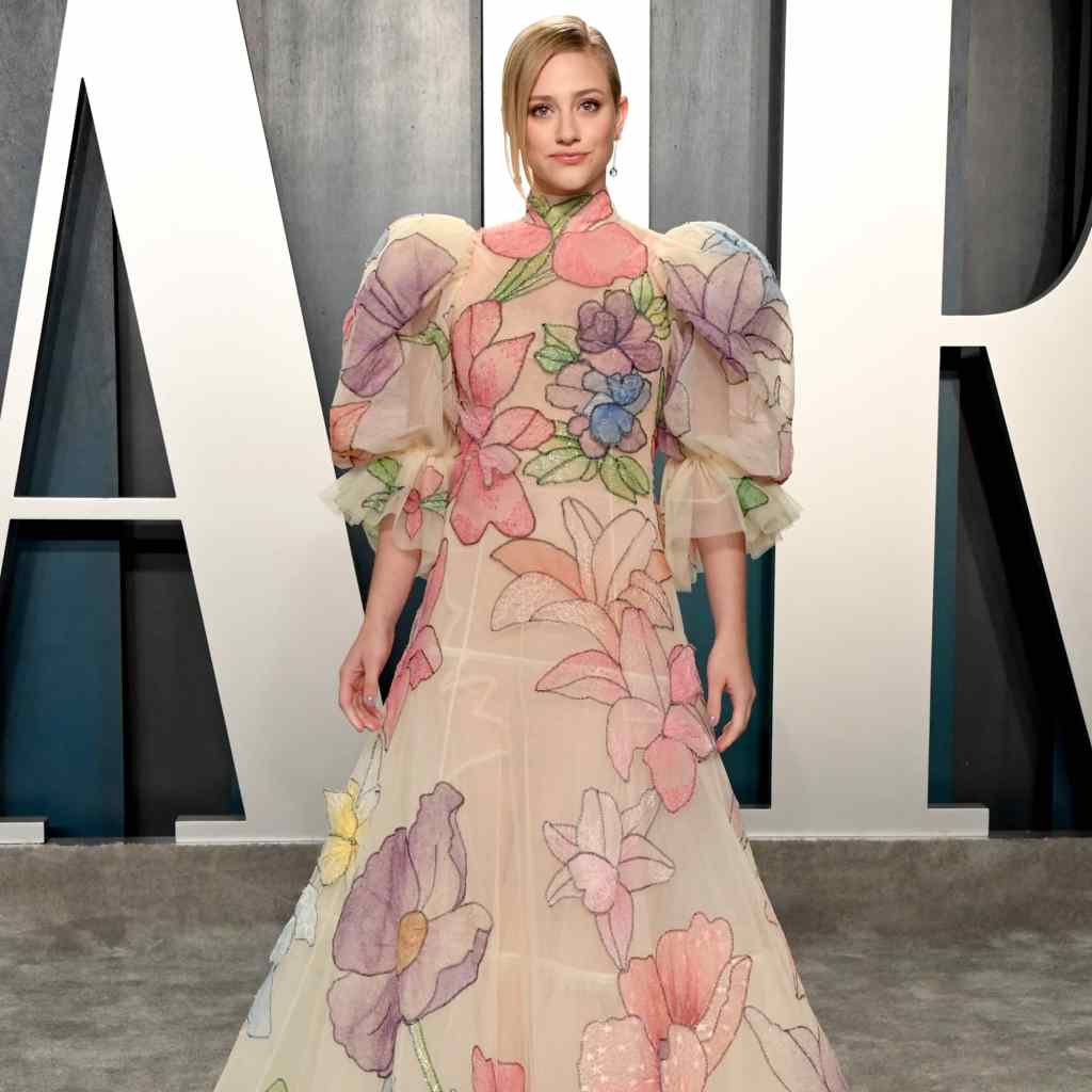 Nothing makes us smile more than Lili Reinhart’s joyful dress at the Vanity Fair Oscars afterparty. The voluminous floral gown featured dramatic puff sleeves and pastel embroidery fit for a princess. Reinhart complemented her look with blue drop earrings and a classic updo. The contrast of colorful flowers against her beige dress was so lovely.