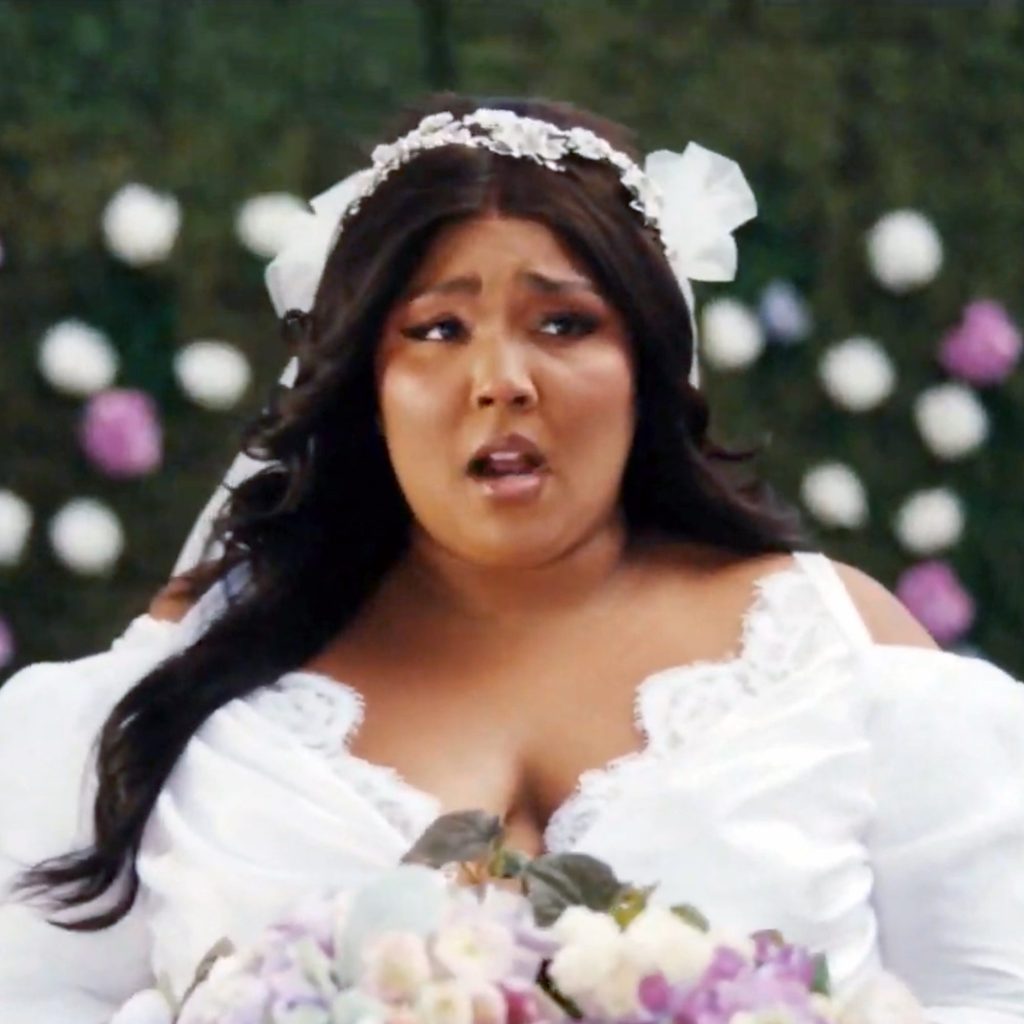 Lizzo might have teased her “2 Be Loved (Am I Ready)” music video in a somewhat simple wedding dress with lace sleeves and a cutout back, but the “Special” singer revealed a much more expressive wardrobe upon the featurette’s debut on Monday, Aug. 15. Styled by Brett Alan Nelson and codirected by Lizzo and Christian Breslauer, the video introduces the global pop star at her wedding ceremony in a completely different gown with poufy half-mesh sleeves, cold shoulders, and a lace-trimmed neckline. But the wrap-effect skirt gets increasingly dramatic, giving way to a thigh-high slit.