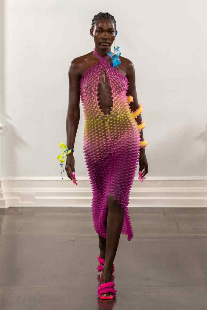 Collections from Rixo, Chet Lo, Maximilian, and Richard Quinn also made it to the top of our lists, because of diverse casting, exceptional designs, joyful colours, innovative fabrics, and a general buzz that they inspired in fashion enthusiasts. Fashion East always delivers, and for spring/summer 2022, Chet Lo and Maximilian are continuing the fashion incubator’s legacy for producing top-notch talent. Lo’s new collection “Splash” is bringing back those oddly satisfying popcorn tops from the early aughts (called durian tops by the designer), but with a twist similar to Pyo’s aesthetic – vibrant punchy pinks and yellows, with design details inspired by swimmers. There’s also a trend of sheer, sensual dresses that we loved at Maximilian’s “ScarletIbis” collection, also seen at Chet Lo, Rejina Pyo, Supriya Lele, Osman, and 16Arlington.