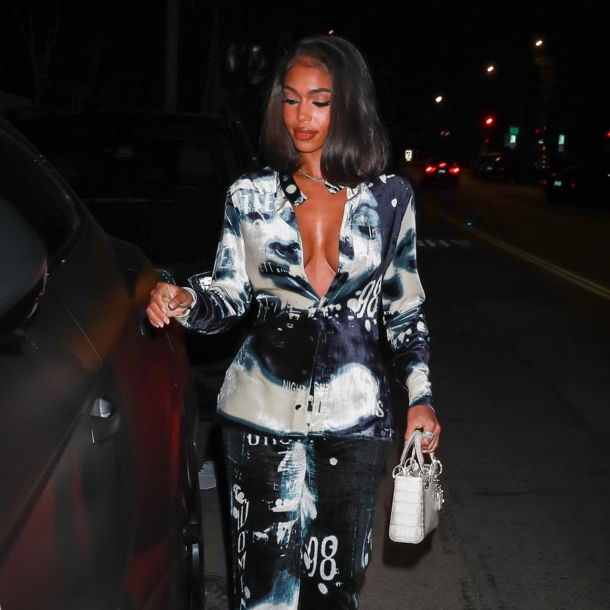 For a girls’ night out in West Hollywood, Lori Harvey opted for a sultry and effortlessly cool set by Jean-Paul Gaultier. The two-piece design features a silky, relaxed blouse, which the Skn by LH founder left unbuttoned, and matching pants, both pieces splashed with a white-and-blue ombré city landscape. Accessorising with a white Lady Dior handbag, a sparkly chain necklace, and black mid-heels, the model showed off her styling prowess on Instagram, writing, “Material Gworl ✨.”