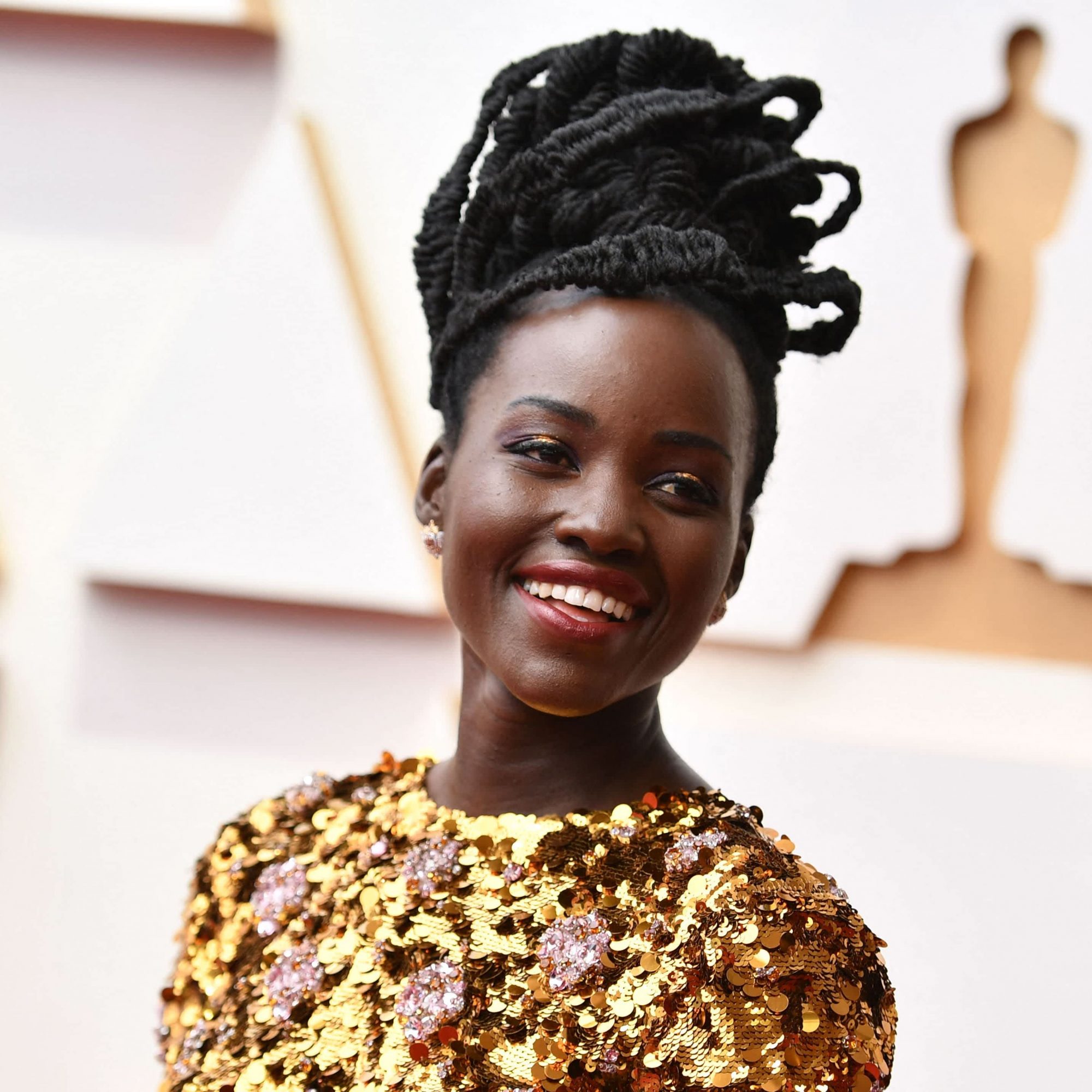 Scroll for an all-angles view of Nyong’o’s golden Prada moment.