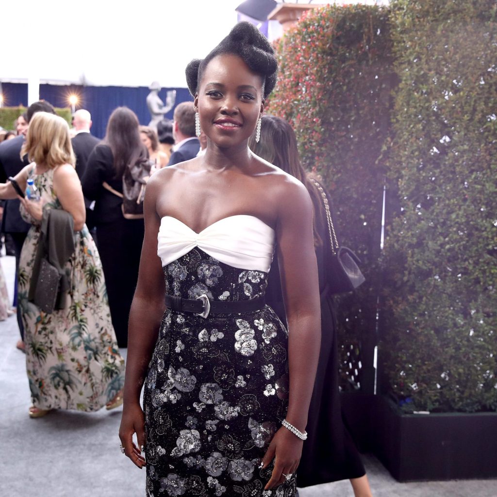 Lupita Nyong’o continues to prove she can do no wrong on the red carpet. The actress attended the SAG Awards wearing a black and white gown that was elegant, to say the least. The strapless gown was designed by Louis Vuitton’s Nicolas Ghesquière. (Sophie Turner wore a hot-pink gown by the designer at the award show!) Lupita’s dress featured a white ruched top that flowed into an embroidered bottom, which had black and silver flowers on it. She accessorized with a black Western-inspired belt and jewels by Forevermark. Read on to see all angles.