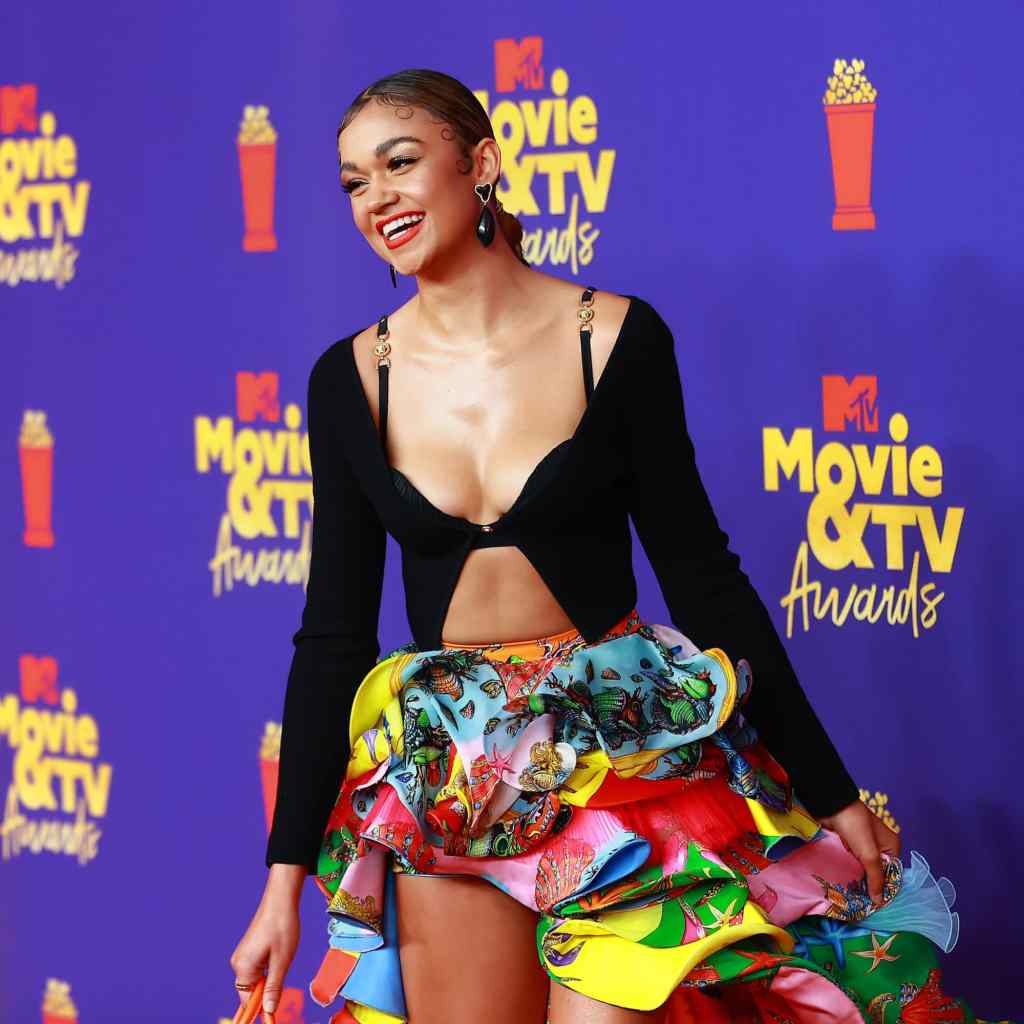 While Madison Bailey’s arrival on the MTV Movie and TV Awards red carpet led to several Outer Banks cast pictures, the spotlight belonged to Bailey as she twirled in her multi-layer, tiered Versace skirt with the iconic starfish print from Donatella’s spring/summer 2021 runway. This isn’t the first we’ve seen of this collection at award shows – Dua Lipa had her take last year and Tiffany Haddish took the same pattern for a spin at the 2021 Kids Choice Awards – and it won’t be the last. Bailey certainly chose one of the most fashion-forward looks from Versace, however, opting for an off-the-shoulder, skin-baring cardigan and exposed bra set with the fashion house’s signature gold hardware. Bailey wore diamond-encrusted, gemstone drop earrings and pink sandals to finish off her look. See every angle of her big moment ahead.