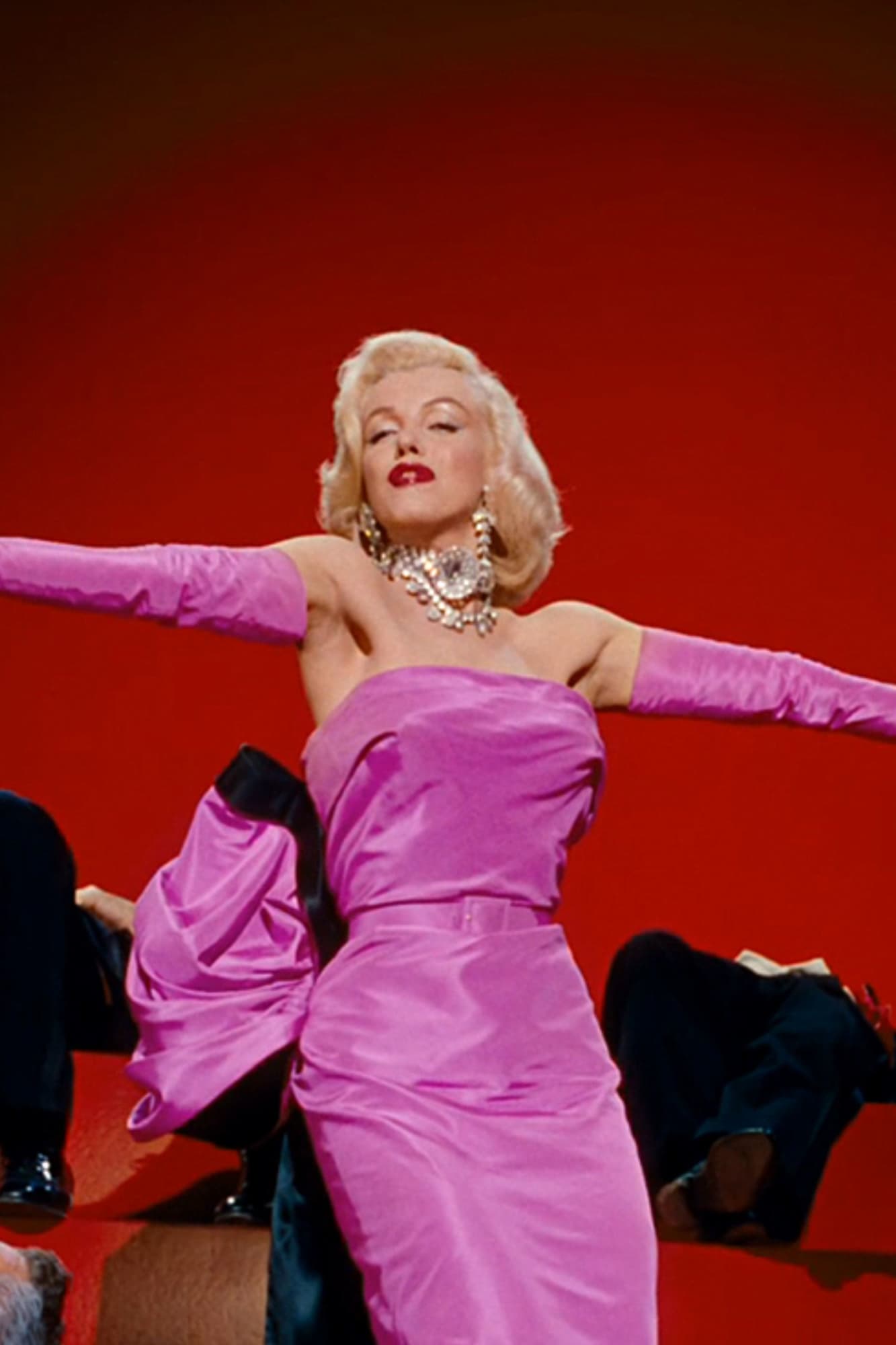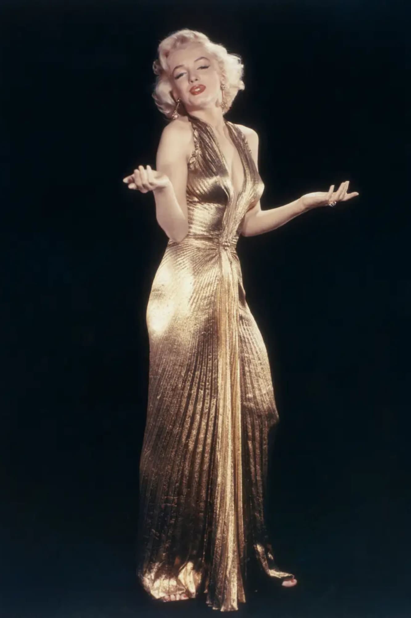 Gold is having a moment right now, so why not get info from the original queen? While performing a scene in Gentlemen Prefer Blondes, Monroe wore a plunging gold lamè halterneck gown with a low back and pleating.