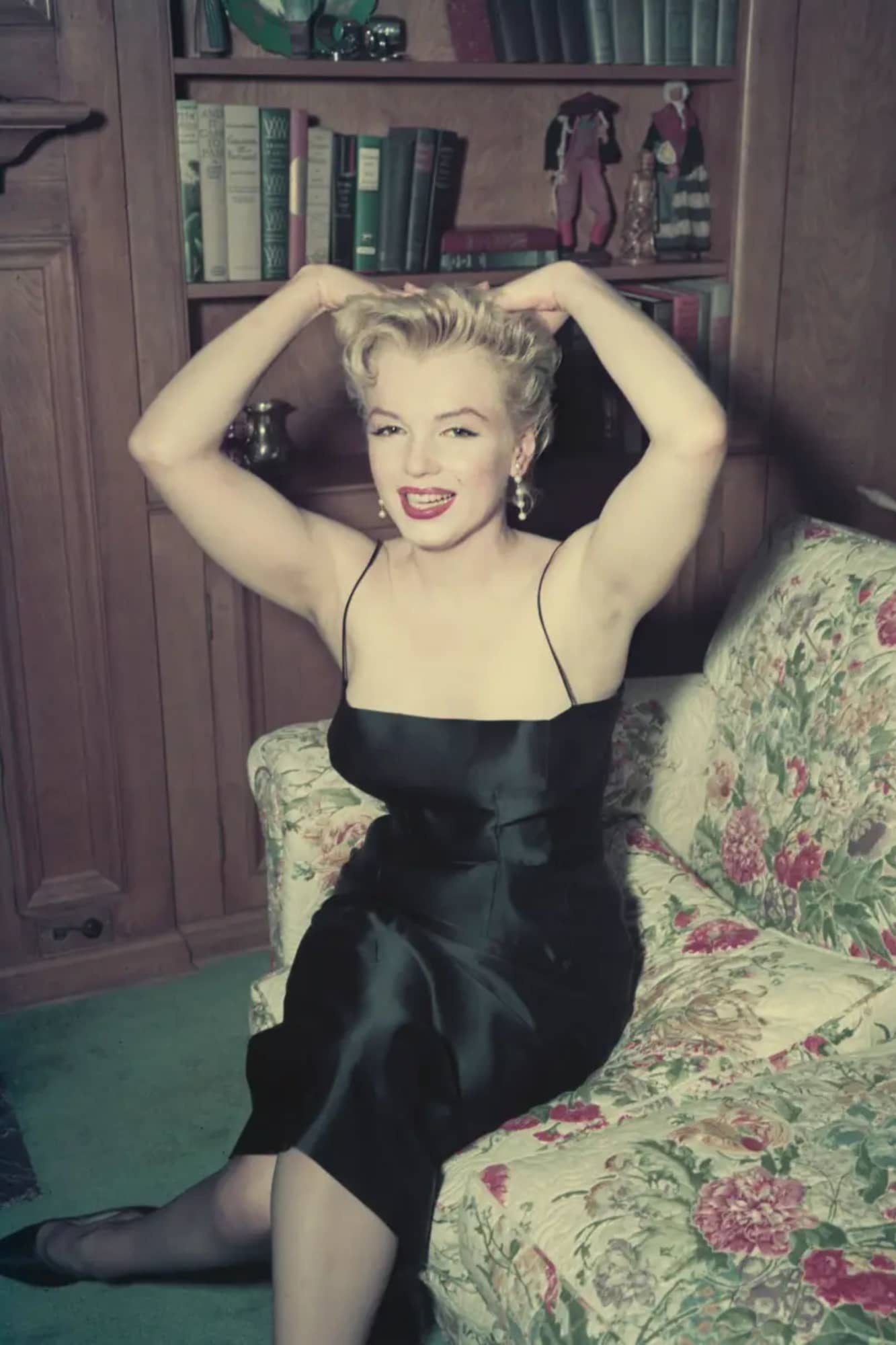 Monroe often turned to minimalist slip dresses offscreen, including this black satin number worn at a party at her California home in 1956. She loved black slip dresses in general, whether it was a casual off-duty look, or a slightly more refined party number.