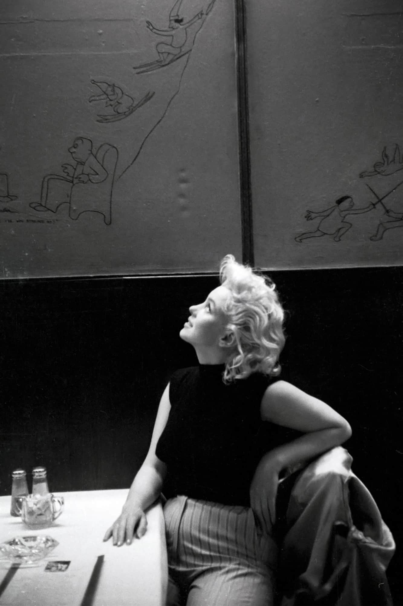 Here, we see Marilyn Monroe relaxing in a quiet moment at a restaurant, in March 1955, New York City. She’s wearing a turtlneck and high-waisted capri pants that were very fashionable throughout the ’50s.