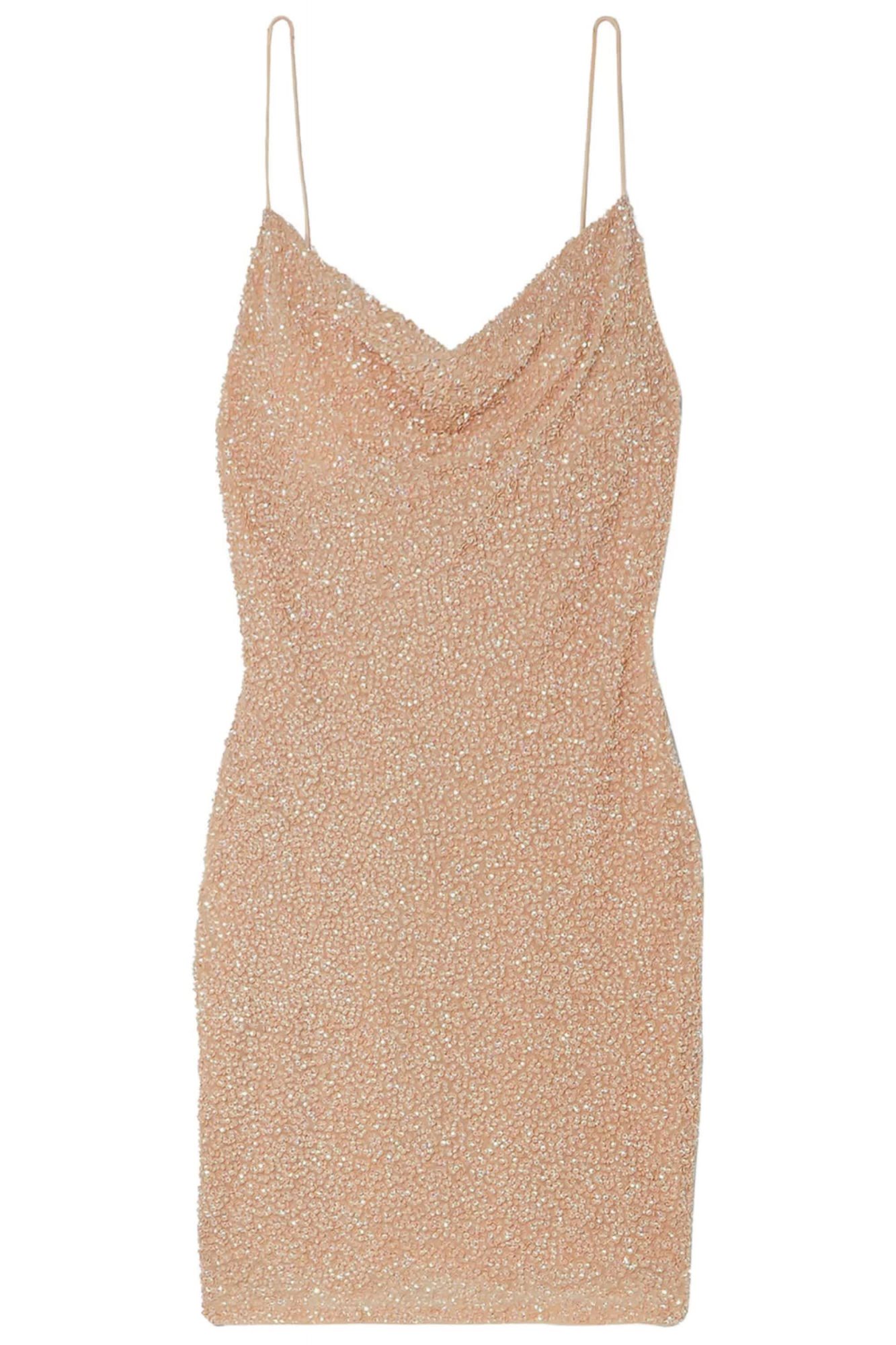 This Alice + Olivia Harmie sequined stretch-tulle mini dress ($171) is a really nice short party version, paired with nude patent heels like these Ravella Harbour ($89.95).