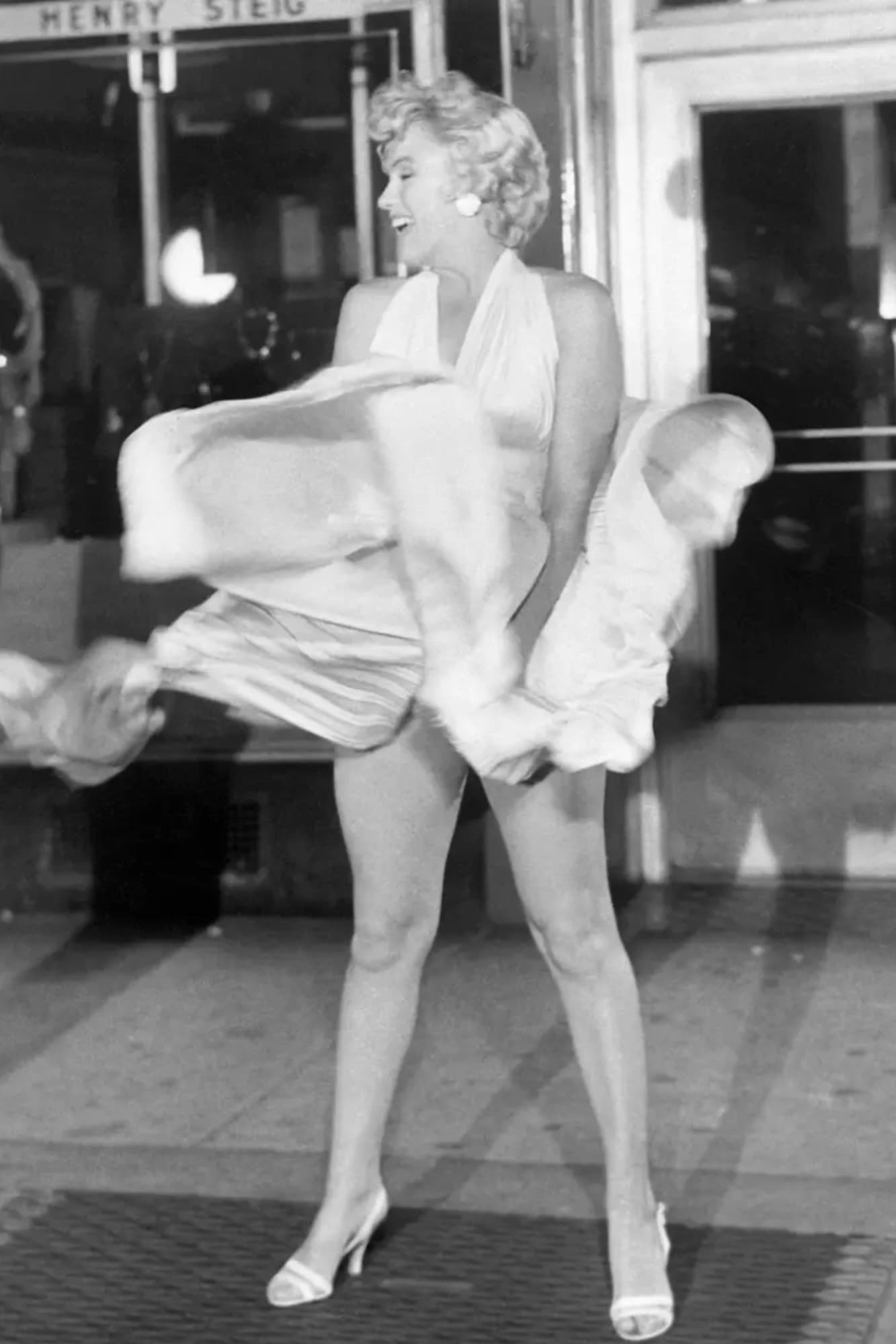The dress — designed by costume designer William Travilla — appears in the sequence of The Seven Year Itch, in which Monroe and costar Tom Ewell exit the Trans-Lux 52nd Street Theatre on Lexington Avenue, having just watched Creature from the Black Lagoon. When they hear a subway train passing below the sidewalk grate, she steps on it and asks “Ooh, do you feel the breeze from the subway?” It blows the dress up, exposing her legs — an image we’ve seen time and time again.