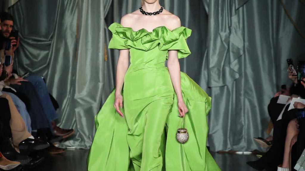 Enter the brocade gowns, slip dresses, and feathered hats that graced the Markarian runway. Sequins covered many of the garments, from a mint-green, off-shoulder draped dress to a red, midriff-baring midi. True to the brand’s ethos, the palette included energising jolts of colour, often in natural shades inspired by O’Neill’s midwest upbringing.