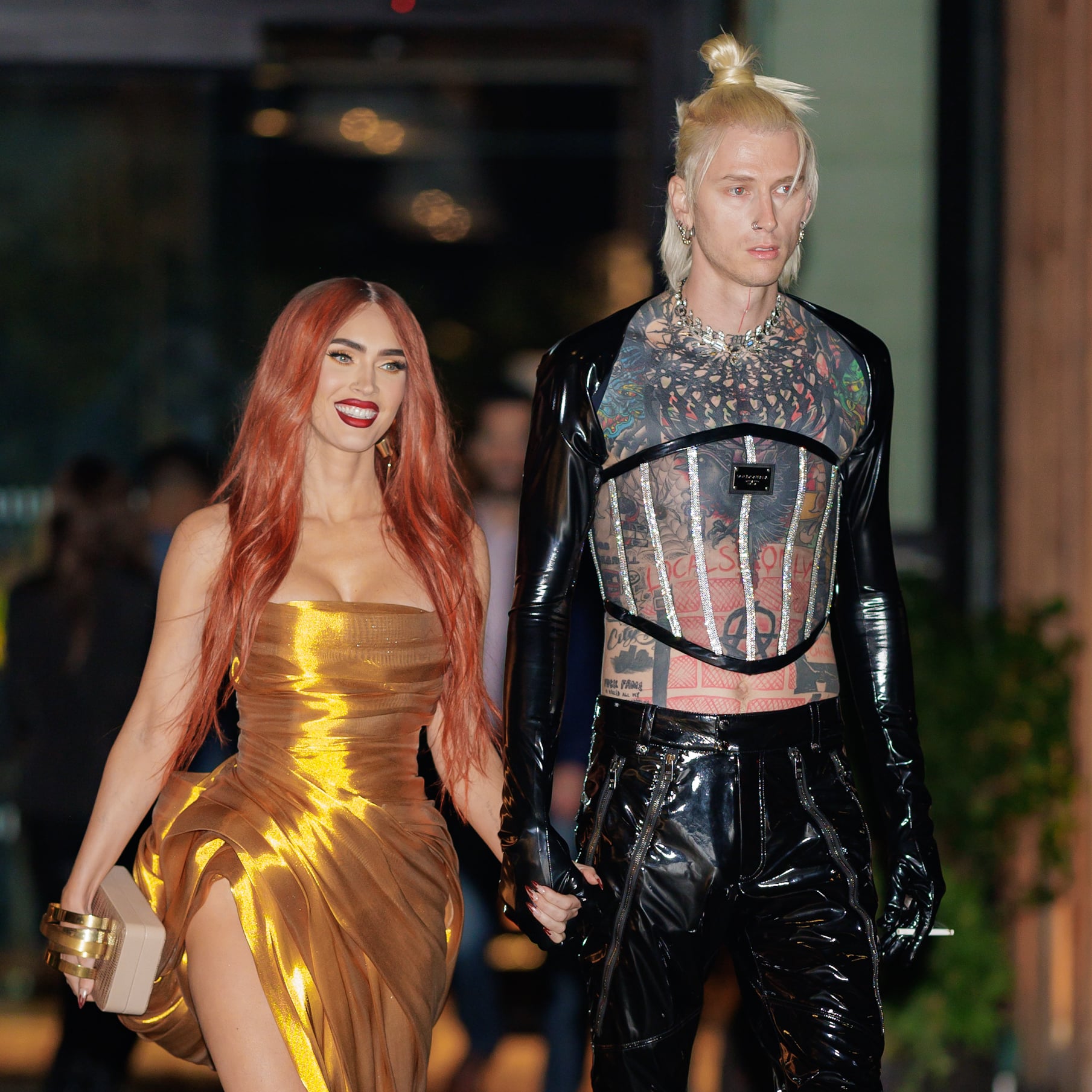 Accented with a dramatic leg slit, Fox’s strapless gold number comes with asymmetric draped detailing that created a high-low design. The actor, who worked with her stylist Maeve Reilly, completed the look with gold additions, including a stack of bangles, metallic ankle-strap heels from Casadei, and a box-shaped clutch. Her eye makeup was coordinated with the color of her gown, while she kept the rest of her beauty look vampy with her blood-dripping manicure and dark red lip. Styled by Adam Ballheim, Machine Gun Kelly went even edgier in skintight black latex pants and a matching shrug, which he paired with a see-through corset top that put his tattoos on display.