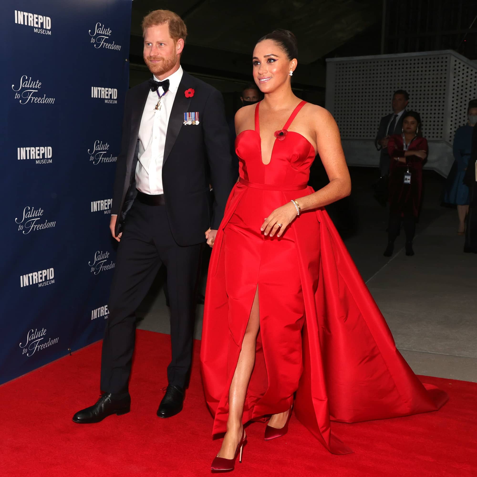 Prince Harry may be presenting the inaugural Intrepid Valor Awards tonight, but Meghan Markle is the one who stole the spotlight. We live for a floor-sweeping train moment, and the Duchess of Sussex just served at the 2021 Salute To Freedom Gala. The 40-year-old mother of two dazzled in a stunning halterneck gown designed for her by Wes Gordon, the Creative Director of Carolina Herrera. The fiery red dress moved beautifully as Meghan graced the red carpet with her husband, on their way to meet with Valor Award recipients.