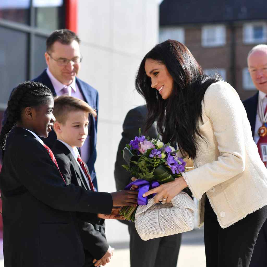 Meghan Markle celebrated International Women’s Day a little early with a group of students at Robert Clack School in Dagenham, England, and she chose an incredibly chic outfit for the occasion. On March 6, she wore a cream belted fringe boucle jacket courtesy of Me+Em over a white top and black trousers. This is a slightly less formal look than the red Safiyaa gown she would wear the following day, but it’s equally smart. It’s what we’ve come to expect from Meghan’s incredible wardrobe.