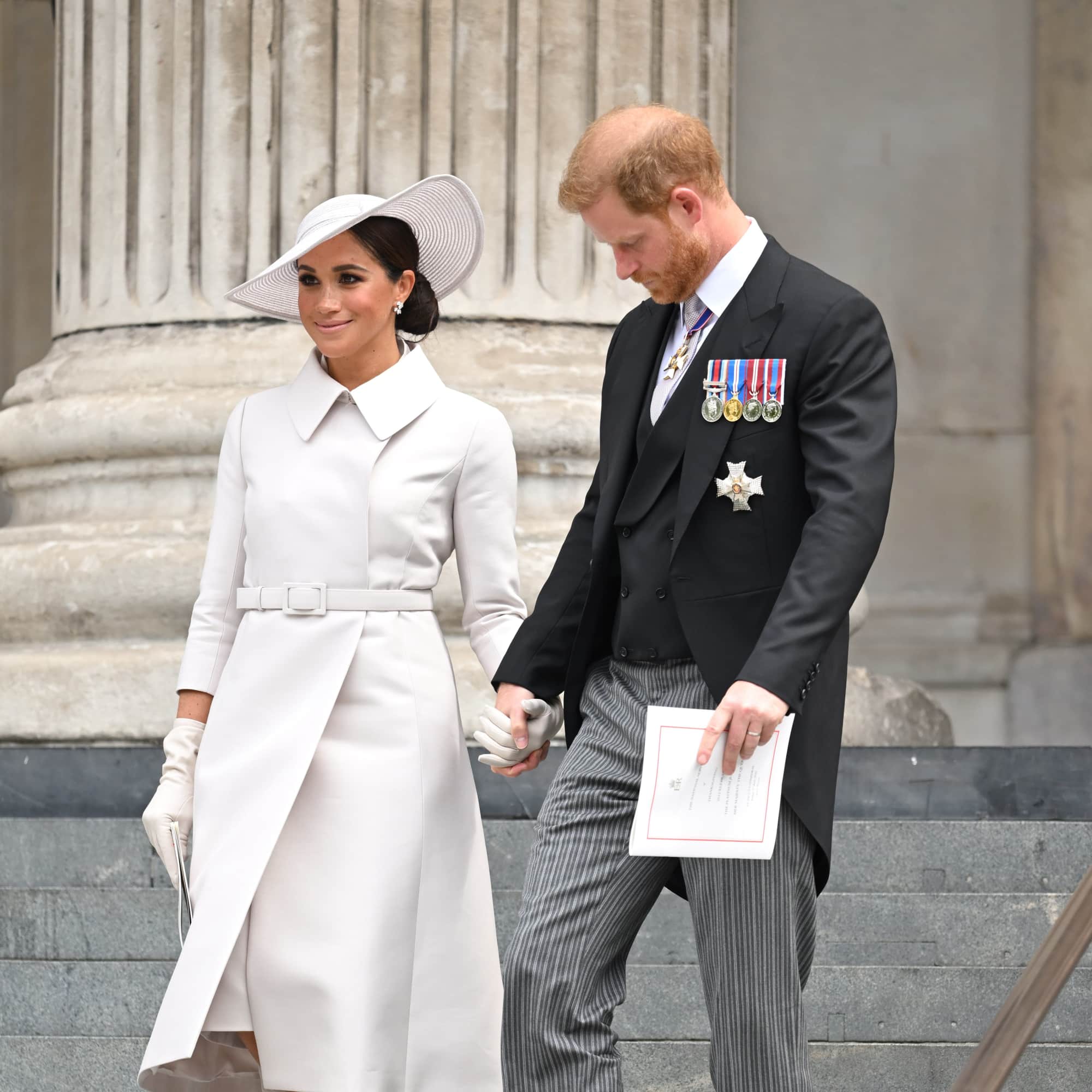 Meghan Markle’s return to London has so far been marked by stylish appearances and sentimental nods to Princess Diana. Back in town for the Platinum Jubilee festivities, the Duchess of Sussex continues to turn heads at every event. A day after channelling the Princess of Wales in a sophisticated off-the-shoulder navy dress at Trooping the Colour, Markle delivered another royal style moment when she attended the National Service of Thanksgiving with her husband, Prince Harry. She arrived at St. Paul’s Cathedral in an all-white Dior Haute Couture ensemble, consisting primarily of a belted coat dress.