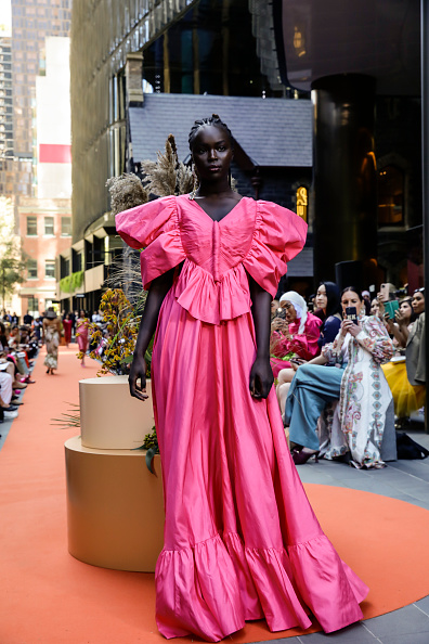 This look combines statement sleeves and a structured bodice, with pink — a shade we simply can’t ignore in 2022.