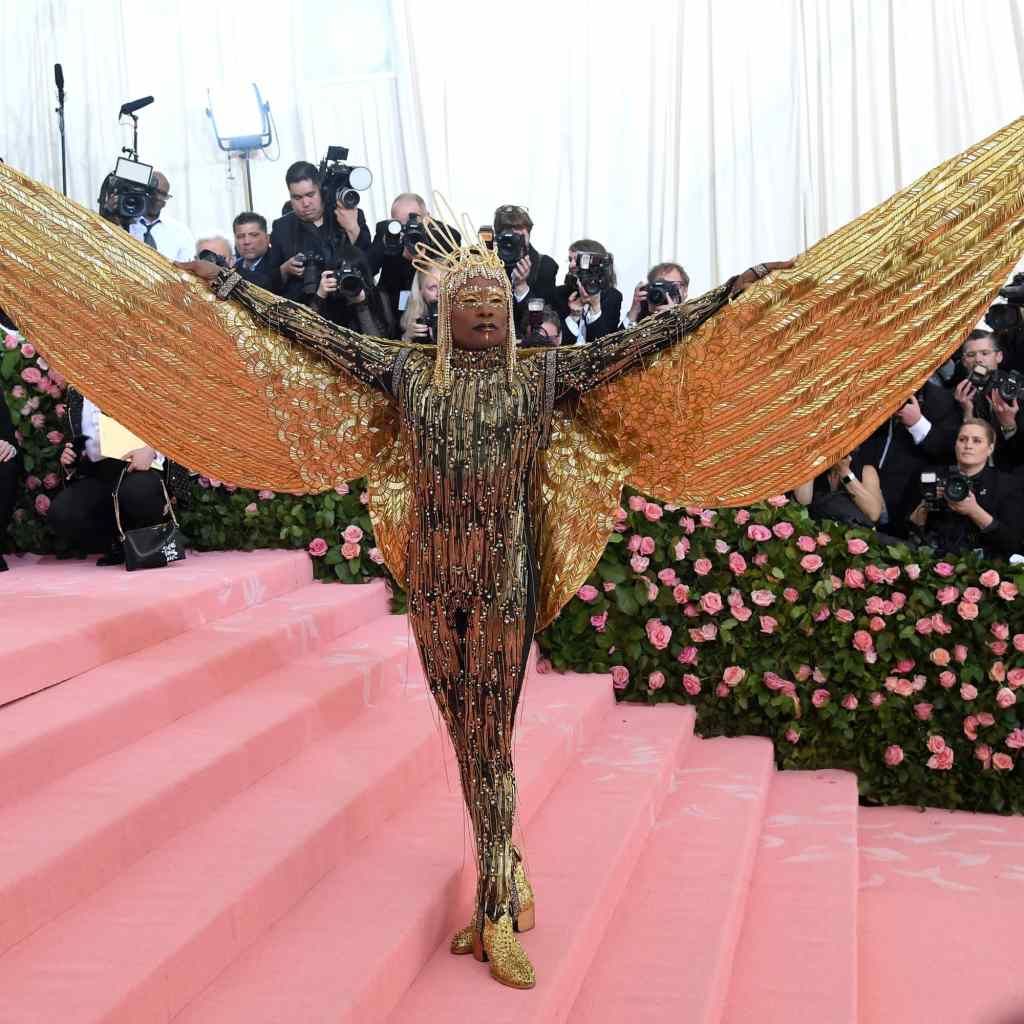In true mic-drop fashion, actor and activist Billy Porter arrived at the Met Gala dressed in a bejeweled catsuit with 10-foot wings, a 24-karat gold headpiece, and custom gold-leaf Giuseppe Zanotti shows. And he did not walk in. No. He was carried onto the red carpet by six shirtless men – a theatrical nod to Ancient Egypt. Inspired by Diana Ross’s Ancient Egypt look, Elizabeth Taylor in Cleopatra and Bob Mackie’s costumes for Cher, Porter and Blonds’ designers Phillipe Blond and David Blond created this show stopping Sun God ensemble.