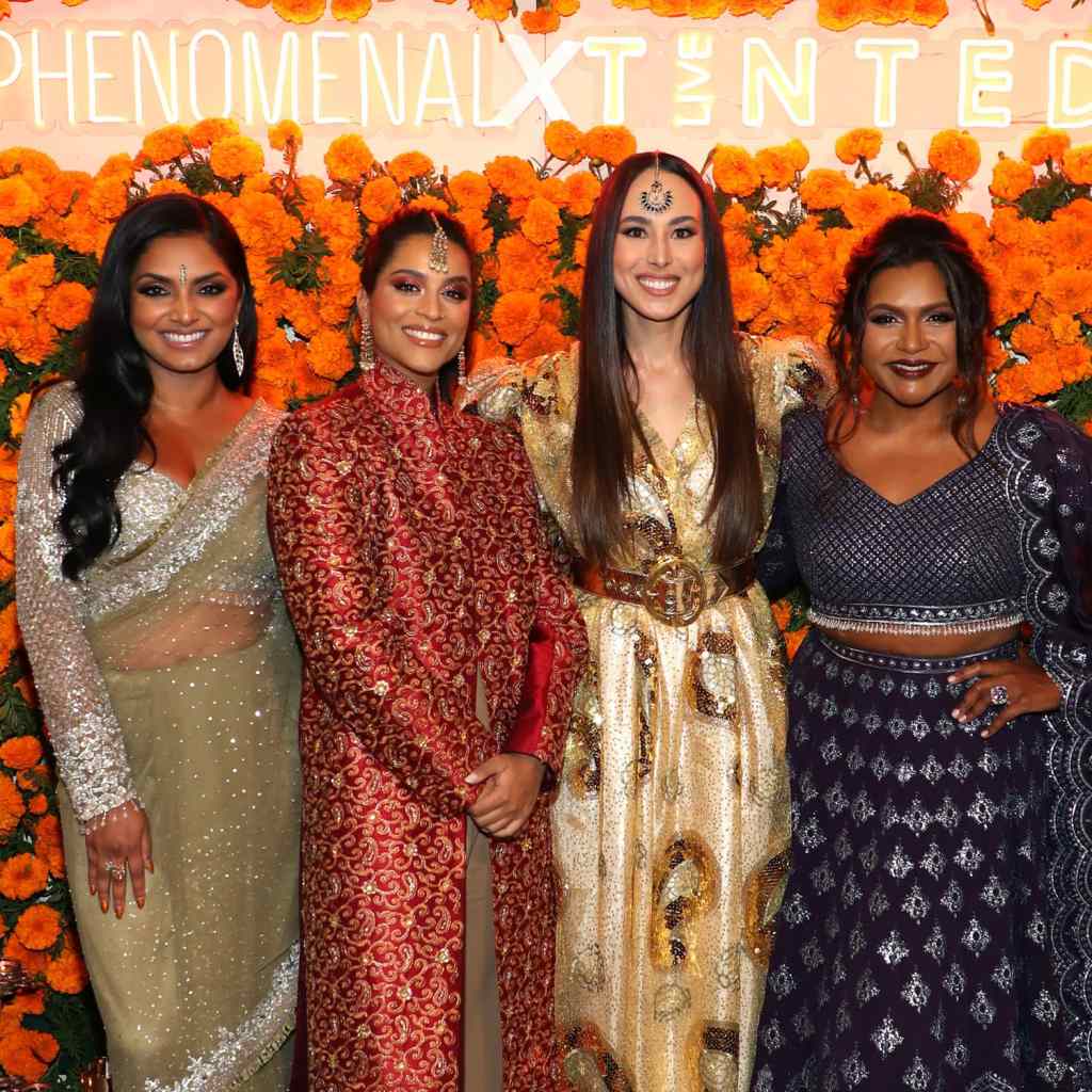 As the night’s host, Mindy dazzled in a custom outfit from Falguni Shane Peacock India. Priyanka Chopra stunned in an Arpita Mehta Floral Print Tiered Georgette Skirt Set, and Meena Harris wore a custom paisley print dress designed by South Asian fashion designer Nina Sarin Arias. While the party was packed with unforgettable looks, the wildly successful women were honored to celebrate friendship, representation, and community.