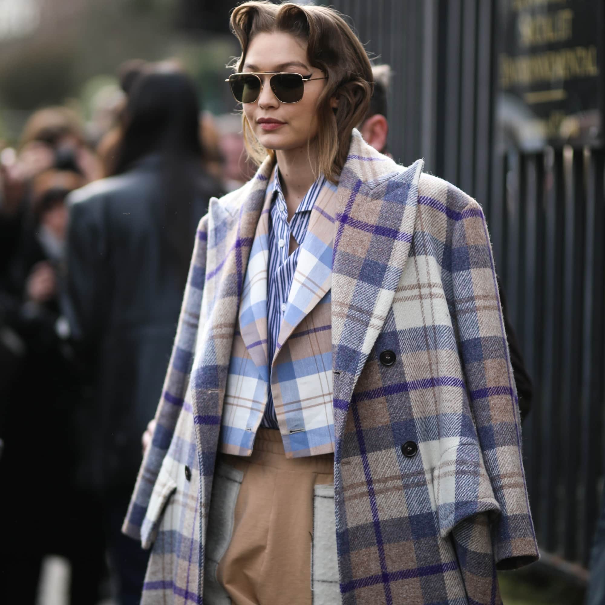 Gigi was spotted for the first time in Paris wearing this checked set with a lime trench and chunky colorblock sneakers.