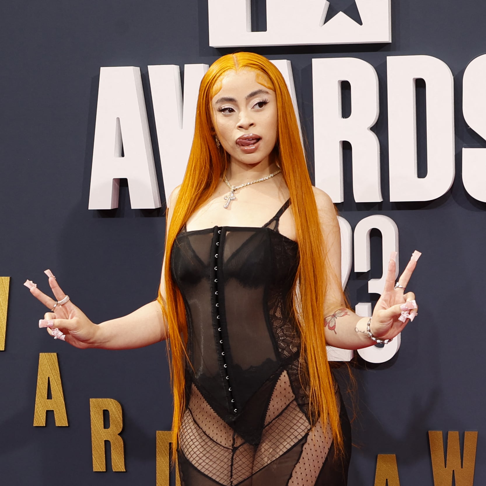Ice Spice in a sheer corset naked dress on the BET Awards red carpet.