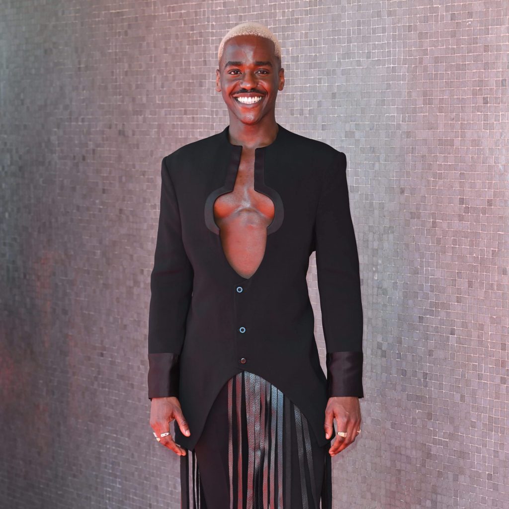 Although Gatwa has great red carpet style, his BAFTAs look was a welcomed departure from the tailored suits and luxe silk shirts of his “Sex Education” era. Gatwa’s look featured a black tunic with seamless tailoring, contrasting silk cuffs, a dynamic “peek-a-boo” keyhole neckline, and a peakcock-inspired hemline. The rigid structure of the tunic was balanced out by the fluid movement of the leather, fringed details, loose-fitting “blossom” trousers, and cosy, leather slide sandals. Gatwa’s stylist, London-born California-based Felicity Kay, completed the look with chunky, silver rings by Bleue Burnham, and freshly dyed blonde hair.