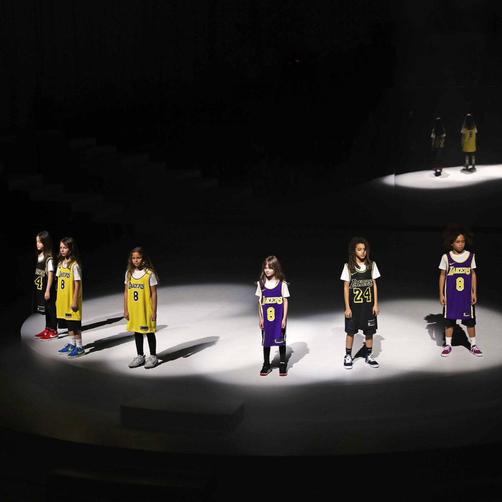 Six children walked out wearing Kobe’s Los Angeles Lakers basketball jerseys, both number 8, which he wore from 1996 through 2006, and number 24, which he wore at the beginning of the 2006 season until he retired in 2016. The kids donned an array of purple, gold, and black jerseys, highlighting Kobe’s legacy after he tragically died last month.