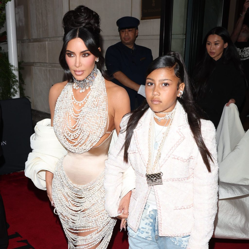 Though Kardashian’s eldest daughter may not have attended the Met Gala with her mom and aunts Kendall and Kylie Jenner, she certainly dressed for the theme of the night. West accessorized her casual outfit with heeled black boots, a pearl clutch, and an assortment of Chanel pearls, including a tiny purse charm. Her ensemble perfectly complemented Kardashian’s custom Schiaparelli look, a naked dress that was dripping in pearls.