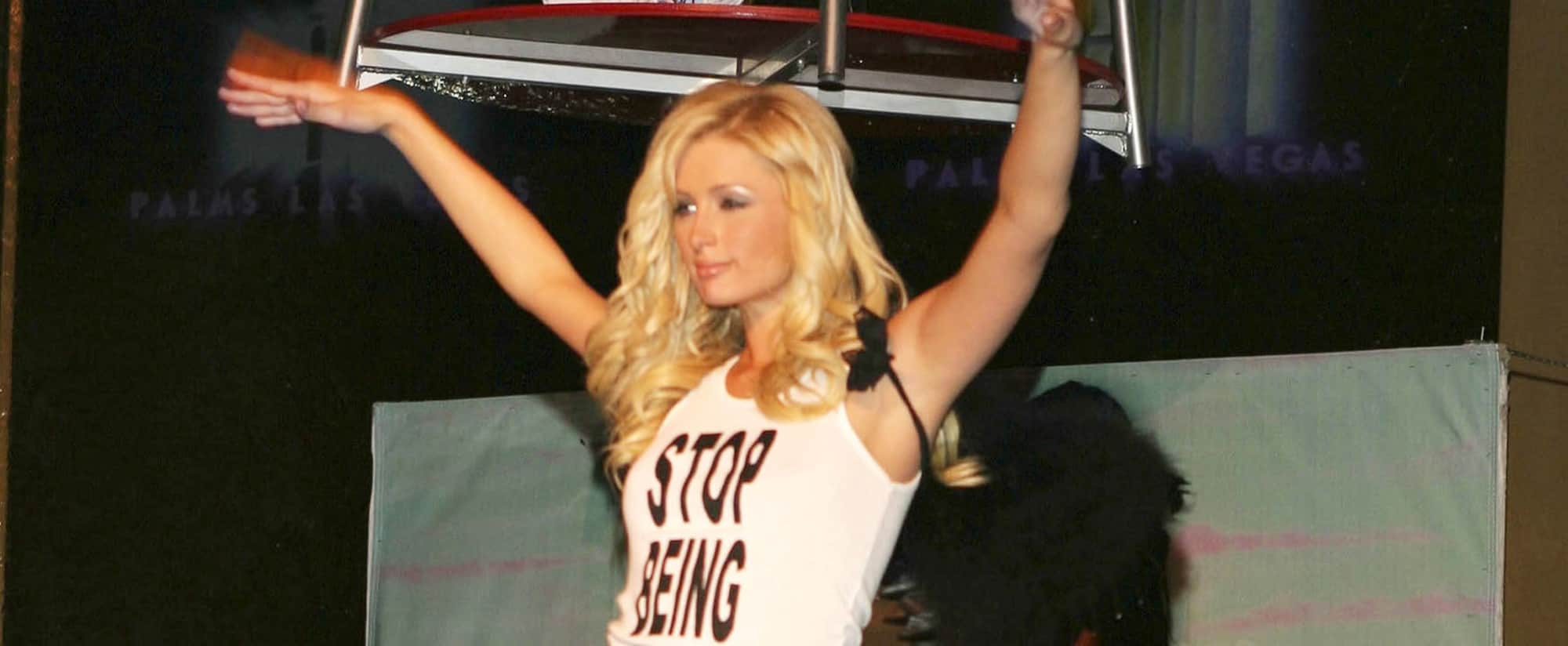 “Debunking the #STOPBEINGPOOR myth. 🙅🏼♀️😹 Don’t believe everything you read. 😏 #Iconic 👑” In the TikTok, Paris revealed, “I never wore that shirt. This was completely photoshopped. Everyone thinks this is real.” She then goes on to show a picture of herself and her sister, Nicky Hilton, wearing the actual shirt, which reads “Stop Being Desperate.” Paris and pal Kimberly Stewart both wore the tank top, which was from the 2005 launch of Nicky’s fashion line Chick, which took place in Las Vegas. Keep reading to watch Paris explain it all. Then, take a look back at Paris wearing the actual tank top during the 2005 fashion show ahead.