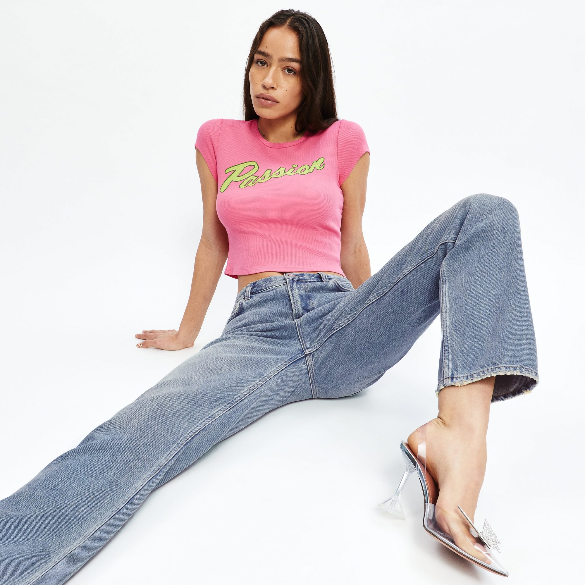 Reformation’s Y2K collection includes: two cropped ’90s baby tees, each with the word “passion” on them, in an azalea pink-and-lime colourway, and a black-and-orange colourway. Y2K for Reformation means a focus on lots of denim, four statement jeans silhouettes in a high rise with comic book prints, a low rise relaxed jean, an azalea pink high rise utility pant, and a mid rise slouchy cargo jean.