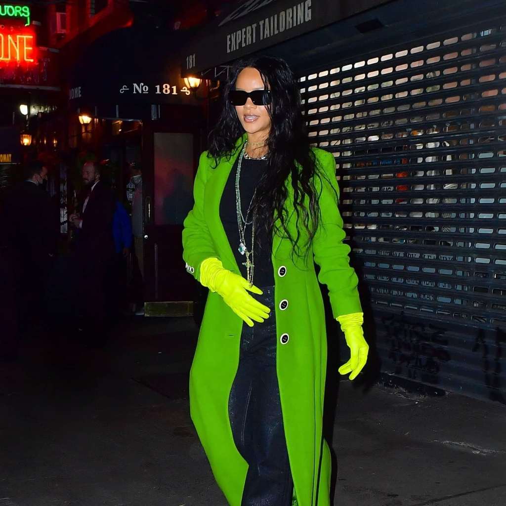 While out in New York City, Rihanna was spotted in a vivid green coat by Marina Moscone, accessorised by a pair of equally flamboyant lime gloves. She kept the rest of the look relatively pared down, sporting a black top and matching Rick Owens jeans underneath. It wouldn’t be a Rihanna look if there wasn’t a stack of necklaces involved, plus some heels from The Attico for added height.